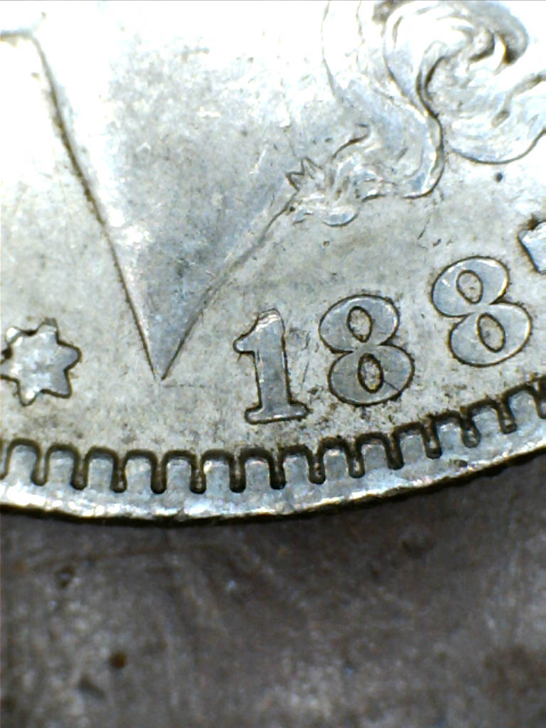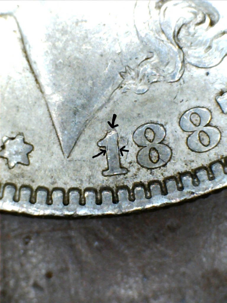 The upper portion of the one looks like PMD to me. I've seen a number examples that look just like that on the date, and it also happens on the stars. If you look on the first 8 at the top it appears to have a hit that creates a similar affect, the same with the tip of the star to the left of the one. But the 2 lines you pointed out on the sides don't look like PMD, don't really know could have caused them. Some random examples I found on VAMworld: VAMworld - 1886-P VAM-6 (on the 6) VAMworld - 1886-O VAM-14 (on the 1).