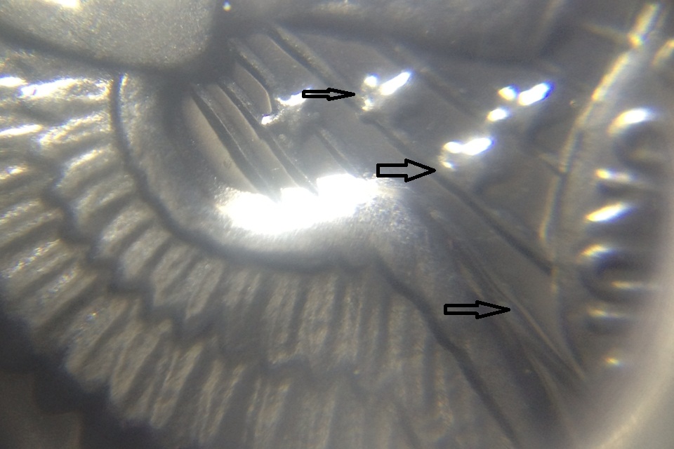 I was looking at this 73 proof set that I have and noticed some things were odd on the reverse of the kennedy half. I searched for a 1973 s kennedy ddr but couldnt find any thing so I snapped some pics through the plastic for you guys to look at and give me your opinion. Hopefully they are clear enough to make out. Look at the arrows I put on the pics and tell me what you guys think.