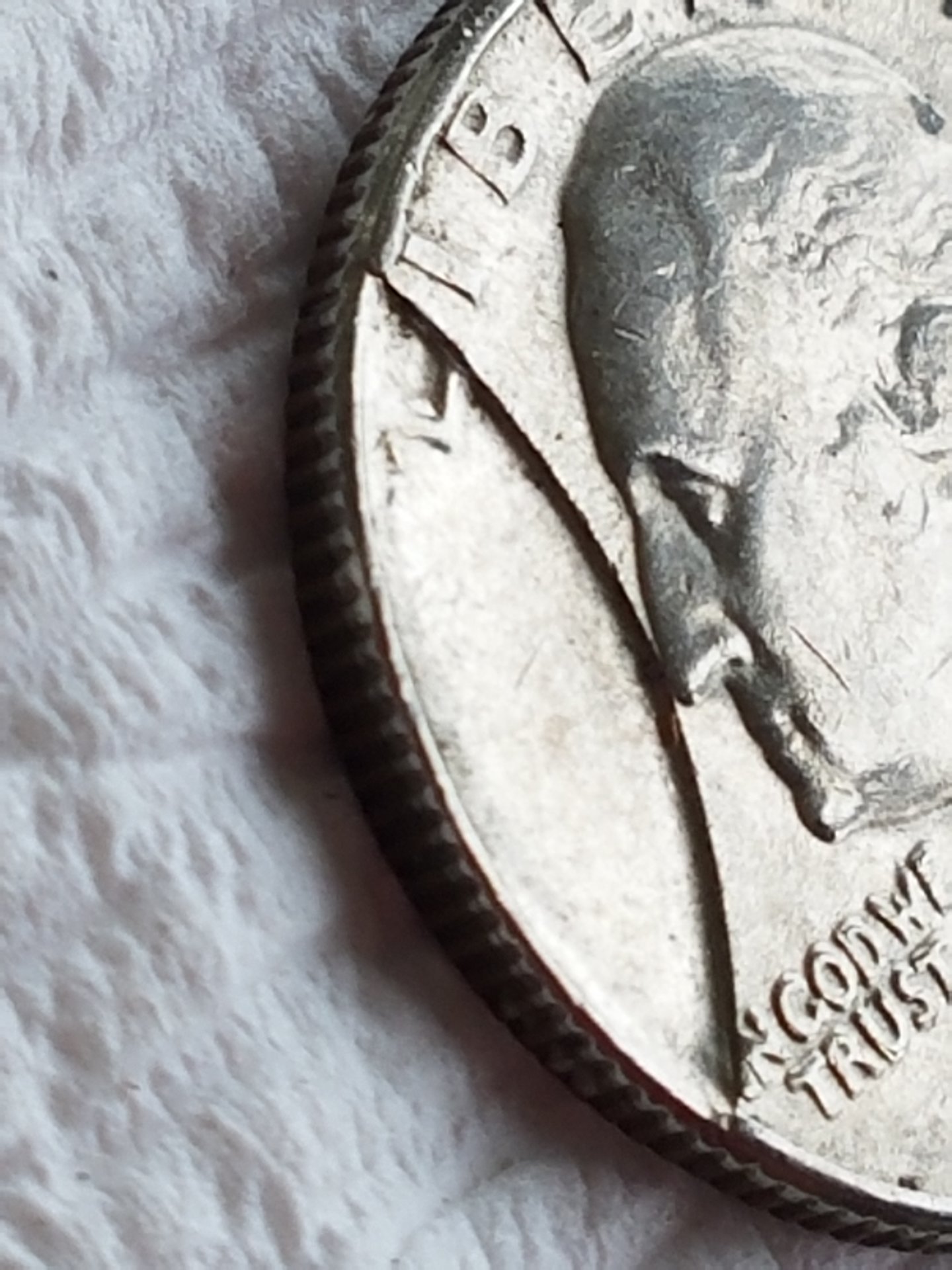 Welcome to CT!!! I agree a photo of the whole obverse will help in diagnosing what we are seeing. Having said that could this be a planchet flaw? Notice how the "L" in liberty is present? Doesn't this indicate that it was minted this way?