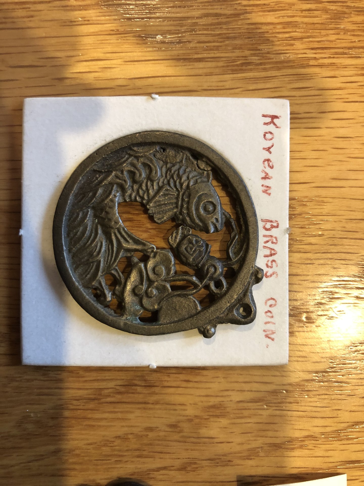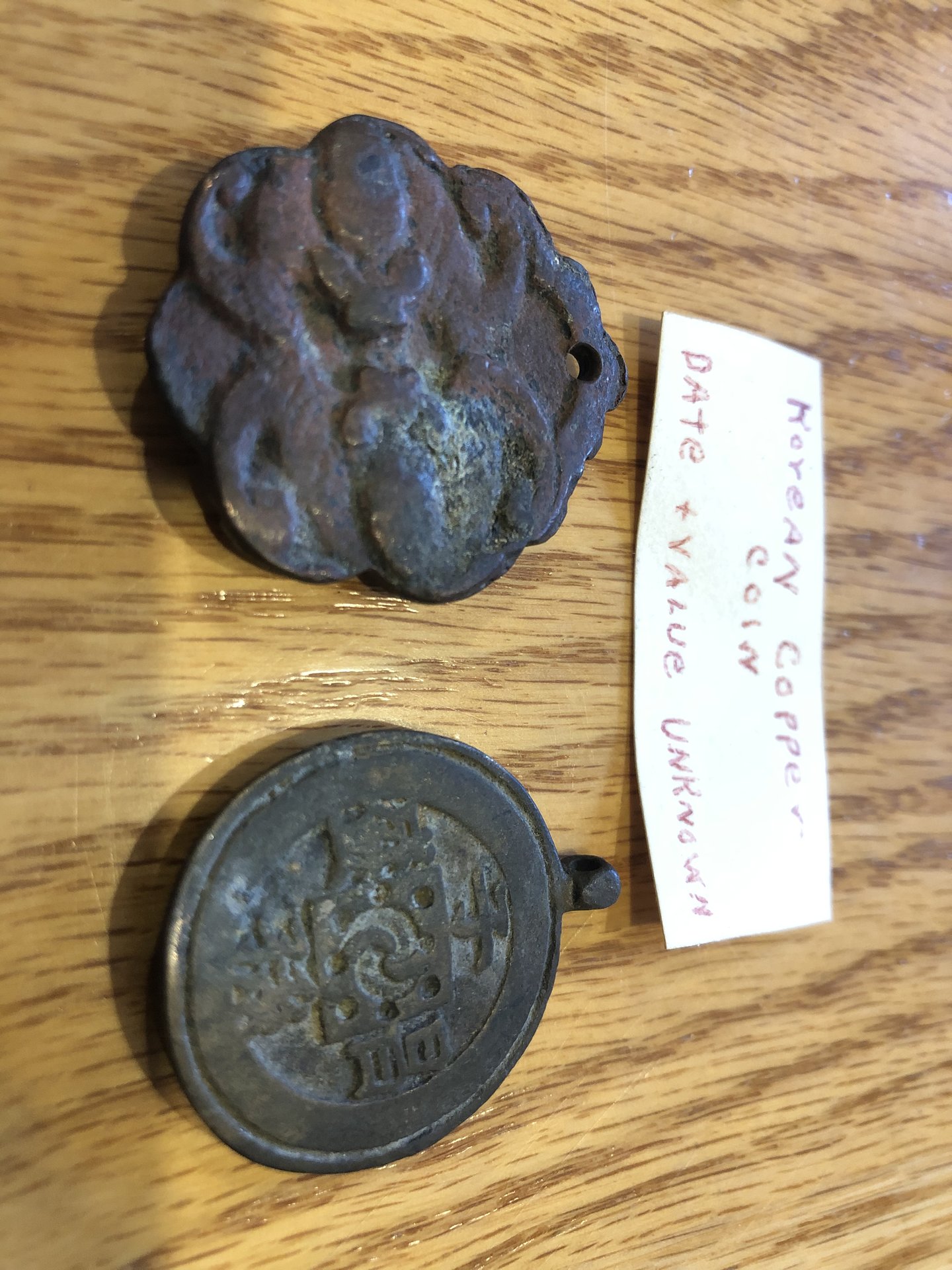 I see nothing on them that immediately screams Korean. They are not coins either.
