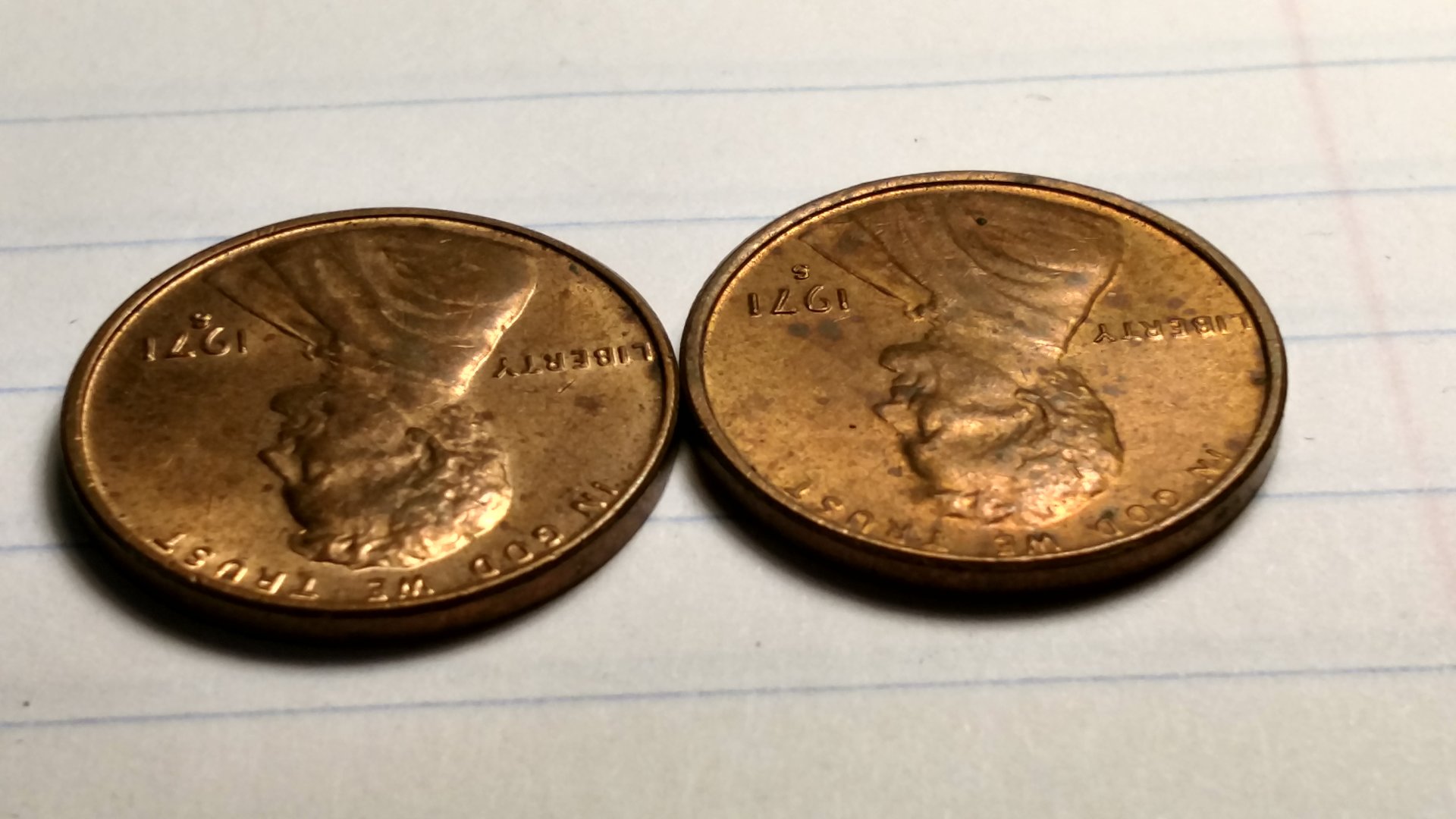 Hello guys, I've been roll hunting again and came across some interesting pennies. They are both 1971 S but one appears to have the mint mark higher and possibly DBL Obv? I took some pics in hope of getting a bit of aid with the visuals, hoping it's not just my bad vision. The coin in question would be the one on the left. To me the lettering at the top, as well as date and Liberty show more bulge and thickness which would signify the DBL error. This is also the coin that has the mint mark much closer to the date. Tried to super scope a pic from above to show the difference. So with that, any opinions on these? Also thank you in advance for any info or input :)