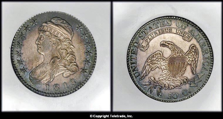 1832 O-112 R2 Capped Bust Half Dollar Obverse: 8 (Second Marriage) Reverse: I (Third Marriage, in 1833 after 1833 O-115)A readily available marriage with specimens graded all the way up to MS66. Known as the Dash Date marriage. Variety Attribution: Obverse-Stars well formed and clear of milling. Date is 8 mm. with rather thick (broad faced) figures. Quickly recognized by the horizontal dash or bar just to left of the base of one, where the one was first started too far to the left. Reverse- 50 C. is 1 1/4 mm. and very high. Top of 5 is a short pointed triangle. Arrow to A is 1/2 mm. I is nearly centered under T. There are two dots 1 mm. apart between crossbars 4 and 5.