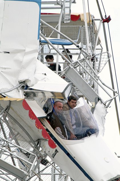 Yeah, there's two kids stuck on the ferris wheel. Good news though, everyboy got off safely. The expression on that guys face is priceless though and you can't help chuckling at thse two knuckleheads..