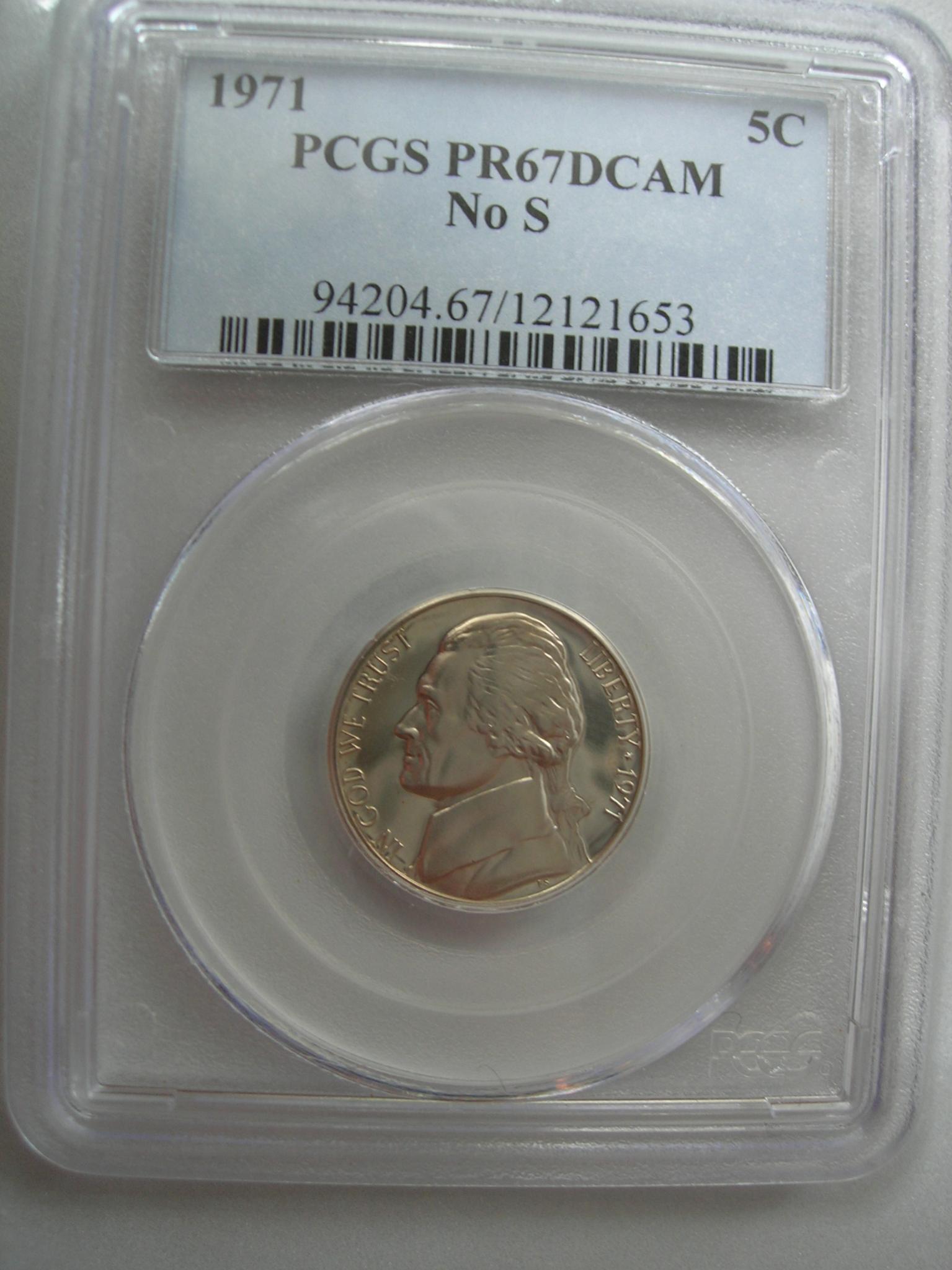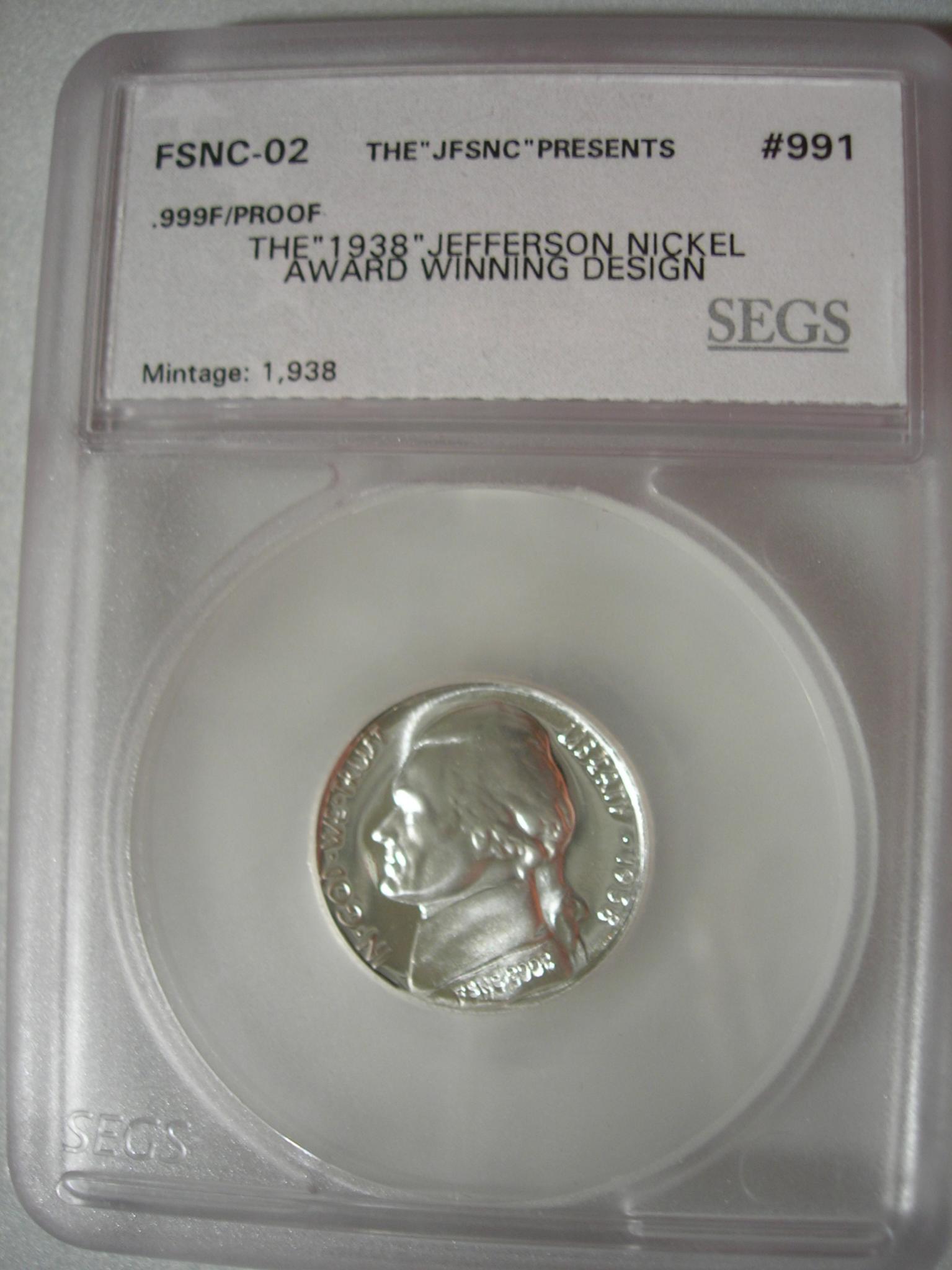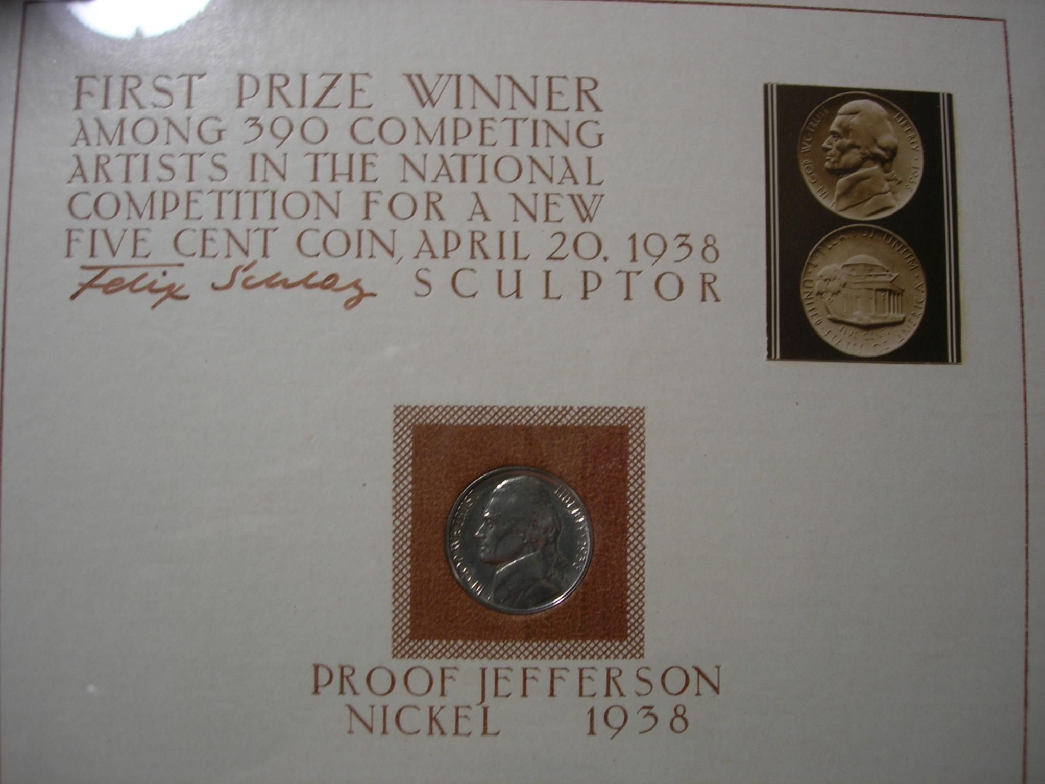 # 1 To answer the first question as it's framed in the orginal frame it came in 1938. The frame is sealed from the back and I don't wish to disturb the orginal backing. Funny you should ask as when I purchased this item I went to a TPG to see if I could have it graded....kind of like they do GSA dollars but with out being able to see the rev. no one would touch it. And again I won't allow it to be opened. But to answer your question yes it is a real Jefferson Proof 1938 Nickel obtained by Schlag from the mint. I bet the rev has some awsome tonning ,but guess we'll never know! But the orginal Art Deco design was reworked by Schlag as requested by the mint so the original design was really never used. So Schlags winning design really was never minted. I will post a copy of what the orginal design looked liked in another post. #2 Yes it is...it also has the signature of his notary and a imbossed seal dated Sept. 29 1939 it is a numbered edtion of only 150 made by Schlag. #3 To me and my collection PRICELESS! It took me over 25 years to find one that I wanted and with a low number...x/150 as stated above, I don't show the numbering for insurance reasons. Cost well let's just say it cost me alot! You can check out auctions and shows to see what they are bring now, that's if you can find one! With the 1971 S no S proof only 1678 mintage the 1997 SP 25000 mintage This is a very rare find yes the mintage of proof 1938 nickels was 19,365 and Schlag was promised by the mint to be able to obtain more proofs but he was only allowed 150 Proof Nickels ,thus only 150 souvenir display pannels. I am still hunting the Schlag souvenir card autogaphed by Schlag.Other low Proof Jefferson mintages 1939 proof 12535,1940 Proof 14,158,1941 Proof 18,720 #4 You look high and low ...mostly when a collector passes on and their family see $$$ they pop up.