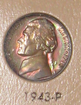 My only slabbed Jeff... Has a beautiful champagne color. This on is a really dark rainbow. Started as blast white when I put it in a frame years ago. The obverse of the coin was in contact with cheap paper behind the frame. The reverse is still bright white. Uglied up the coin pretty good IMO. The fingerprint doesn't help either... Edit: Here is the same 43 with a flash photo...