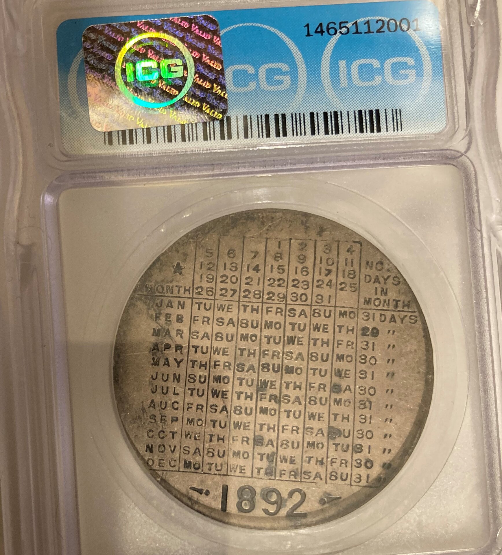 The New York World was a newspaper published in New York City from 1860 until 1931. The paper played a major role in the history of American newspapers. It was a leading national voice of the Democratic Party. From 1883 to 1911 under publisher Joseph Pulitzer, it was a pioneer in yellow journalism, capturing readers' attention with sensation, sports, sex and scandal and pushing its daily circulation to the one-million mark. Joseph Pulitzer bought the World in 1883 and began an aggressive era of circulation building. Reporter Nellie Bly became one of America's first investigative journalists, often working undercover. As a publicity stunt for the paper, inspired by the Jules Verne novel Around the World in Eighty Days, she traveled around the planet in 72 days in 1889–1890. In 1890, Pulitzer built the New York World Building, the tallest office building in the world at the time. This is a large sterling silver calendar medal for 1892 "Over 300,000 copies per day guaranteed" presented and engraved to an individual by "The World" with a complete calendar on the reverse. I think it's a neat little historical piece (though I think ICG was a bit harsh on the grading) .