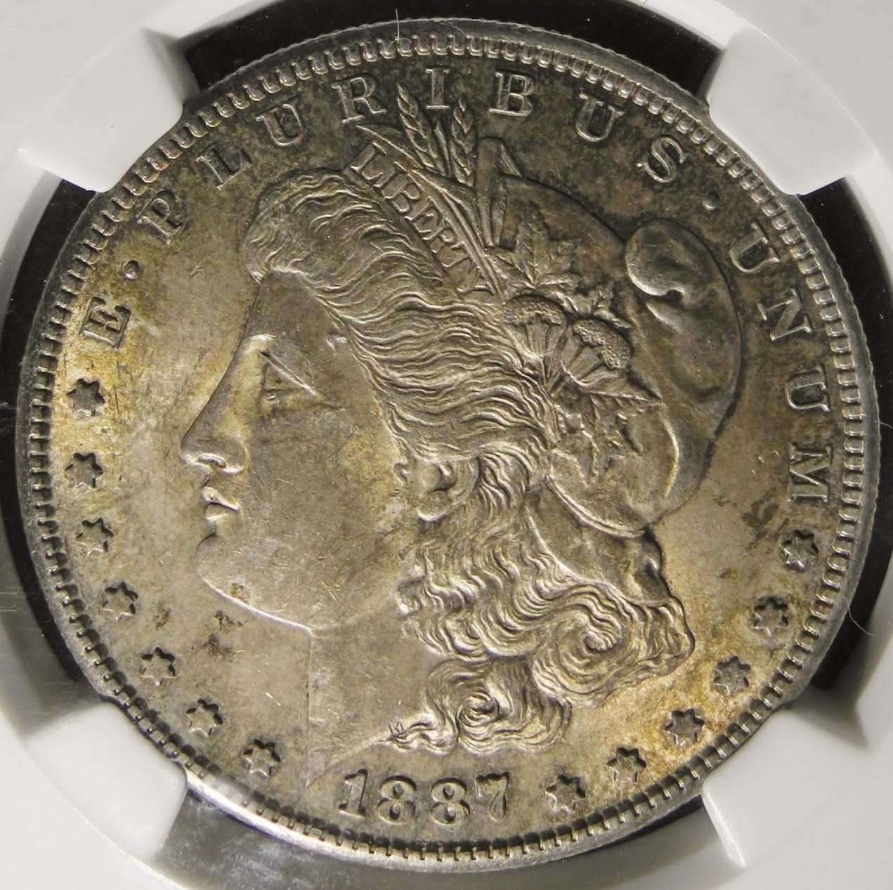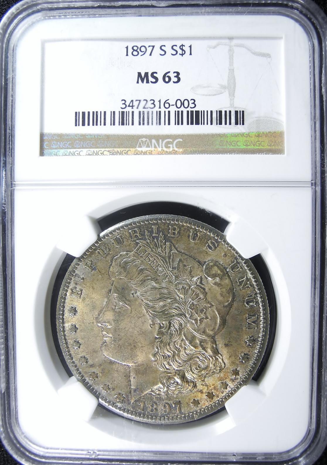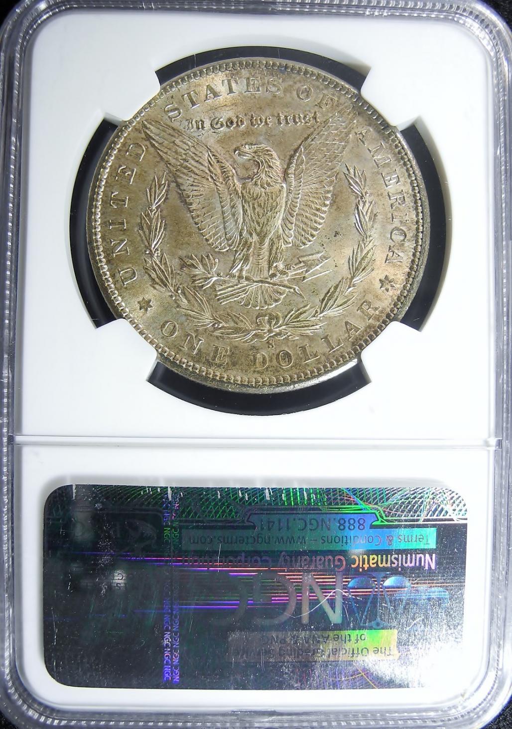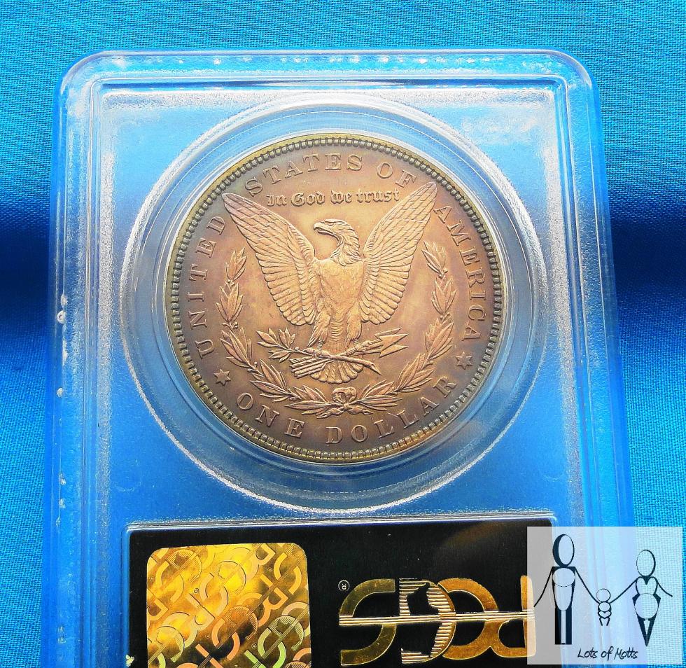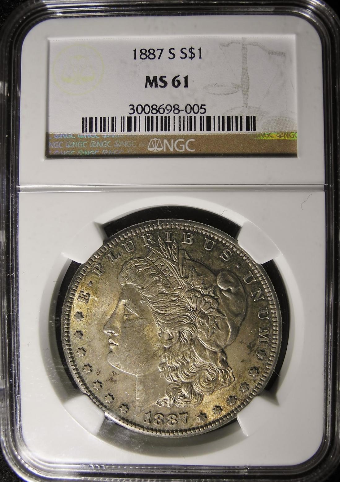 Latest grab at auction--very tough date in MS, like all of the later 80s S mint Morgans. With nice golden toning, even more difficult. Good pickup, as it was priced low for a coin with nice toning. Low pop in any MS grade for Morgans.