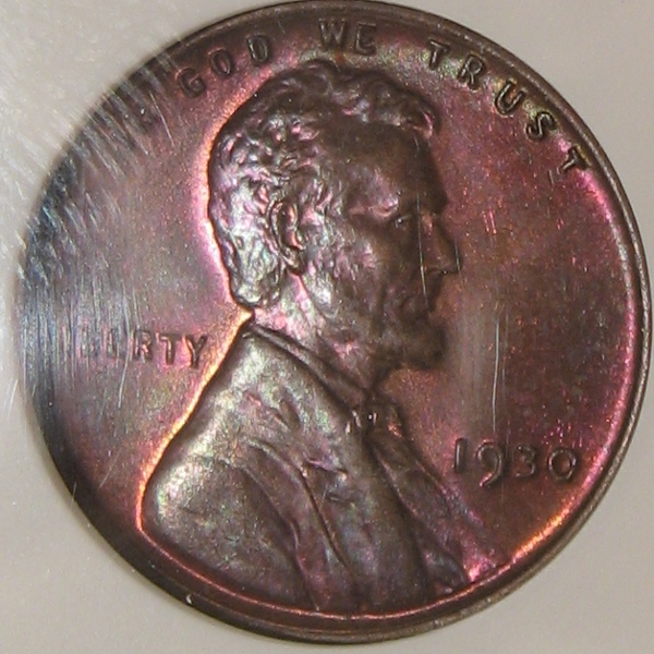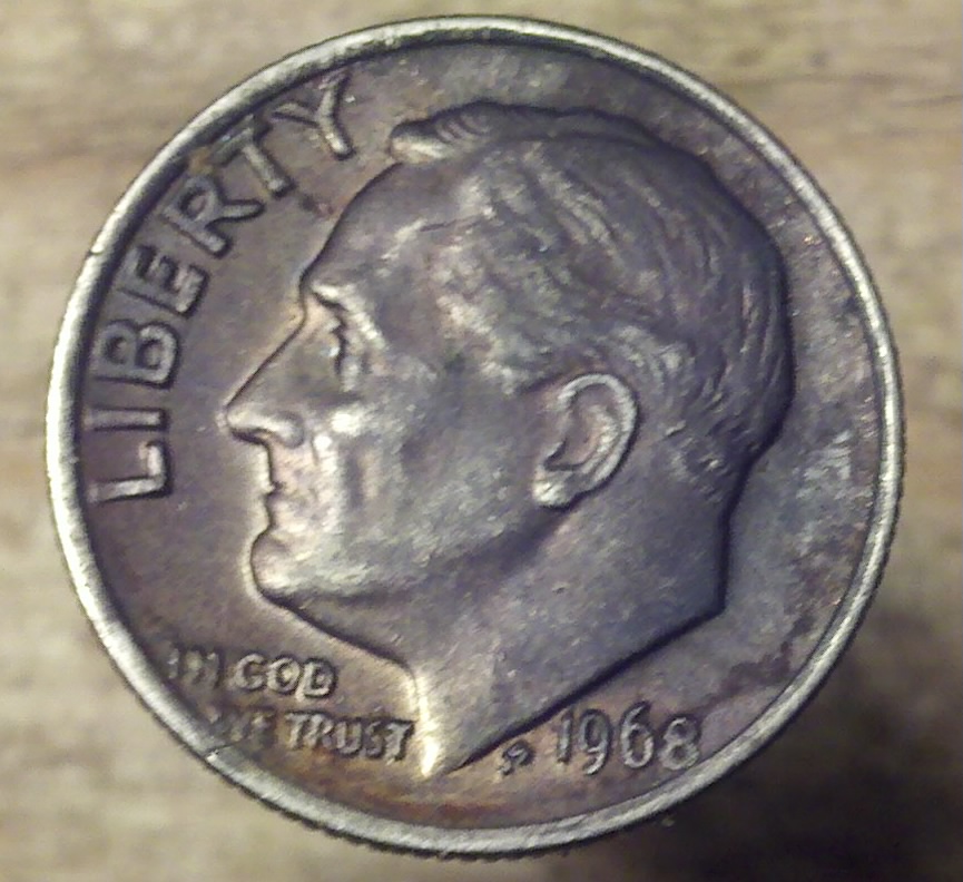 The toned dime giveaway prompted me to dig this one out-the reverse has gorgeous pastel-looking toning. My husband got it in change and his first impression was that it was dirty or had been burned until got we closer look.