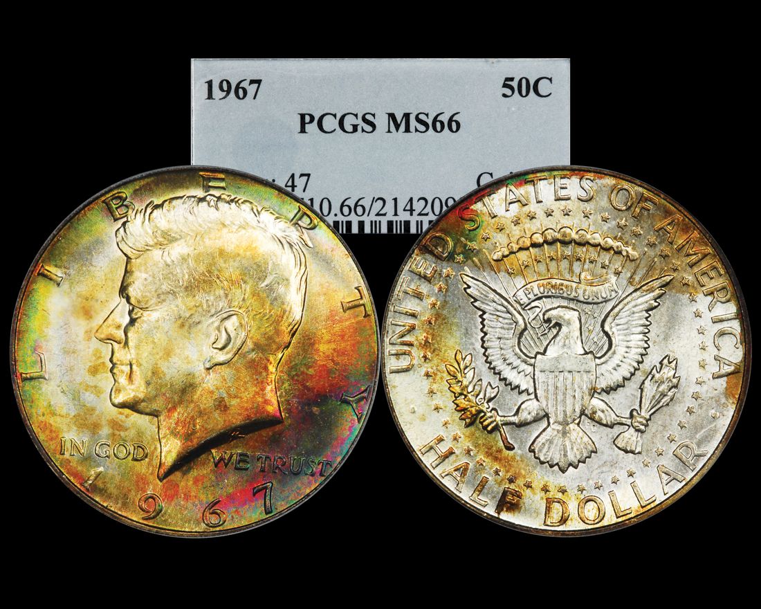 1967 Kennedy Half non-SMS MS66 PCGS 'Picasso Toning' One of my all-time favorite toners: "Picasso toning." I snagged this one off of eBay a couple of years ago for a song--and wouldn't give it up for a whole opera!