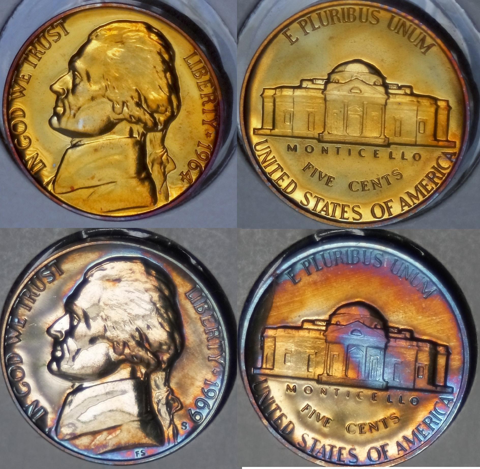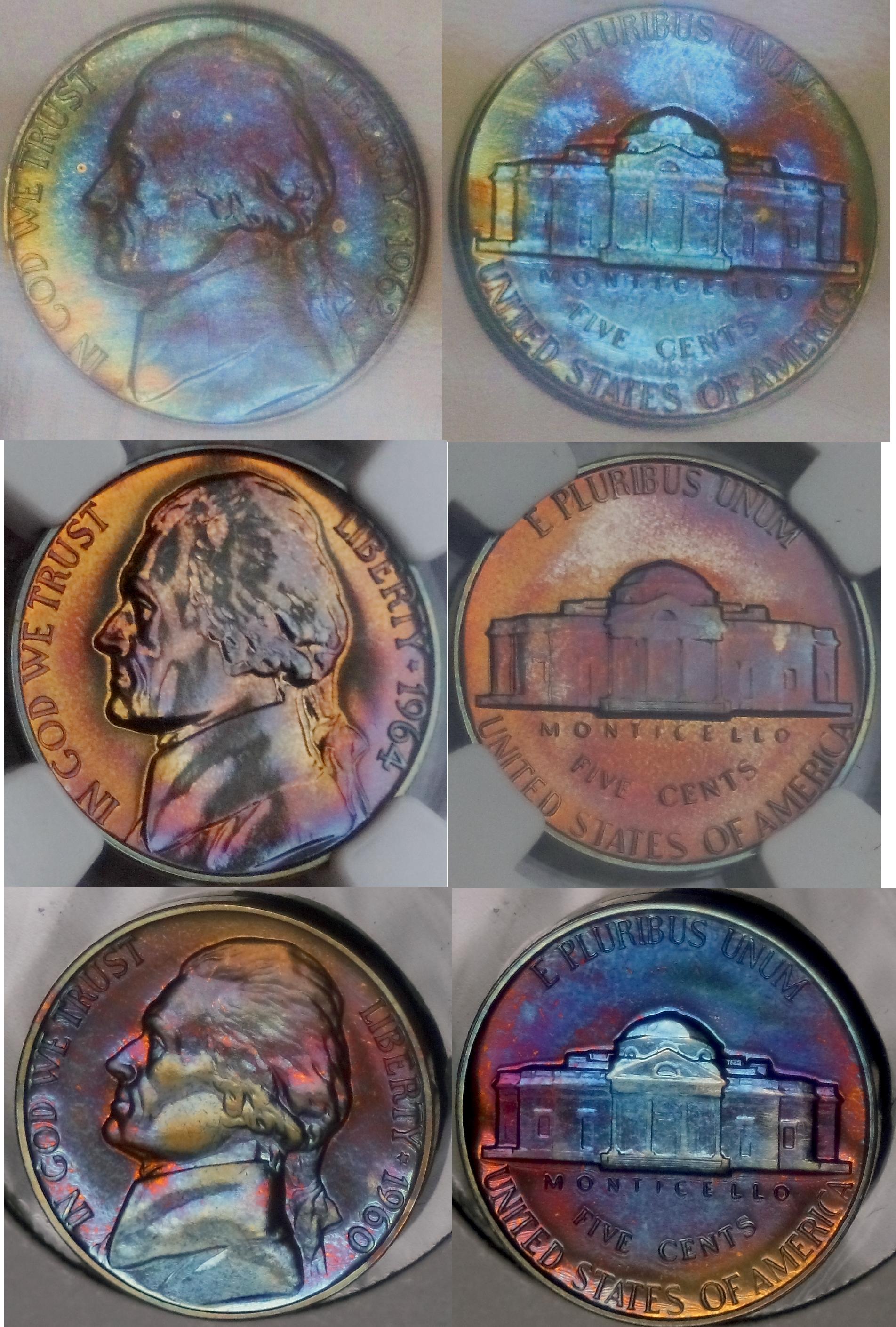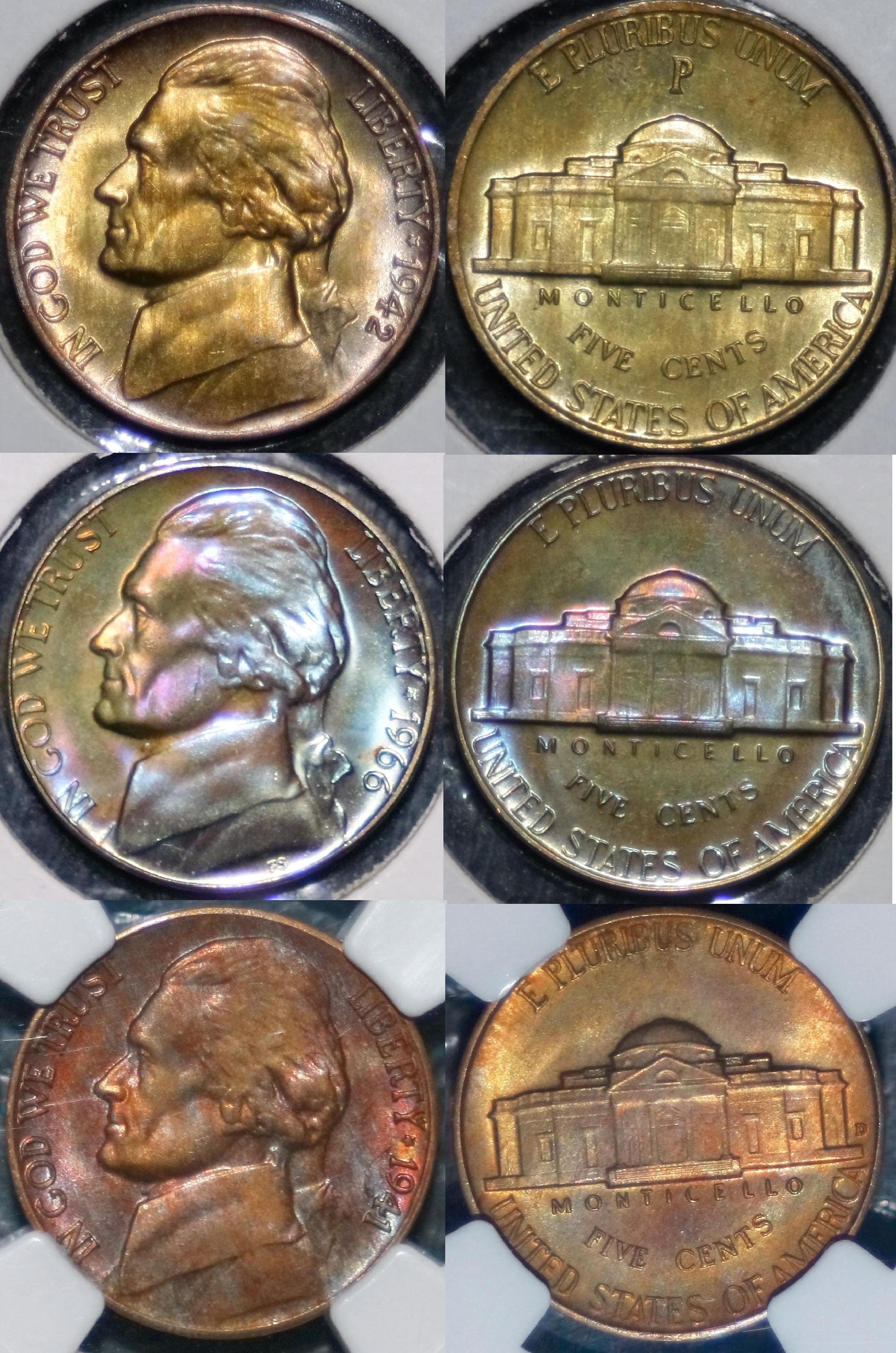 The reason why the acceptable examples are book toned, is because that is how almost all Jefferson Nickels develop their toning. And while you say that it is very very easy to mass produce album toned Jefferson Nickels quickly, their scarcity in the market place contradicts your assertion. Everyone seems to think that if you place your coins in a Dansco, leave it in a room without air conditioning, and wait a year, that you will end up with a book full of fantastically rainbow toned coins. That just isn't reality. Most album toned coins end up with some simple brown/russet toning on the peripheries. Furthermore, while using intent might seem like a good idea to delineate AT from NT, it can't ever be proven and is therefore a useless endeavor.