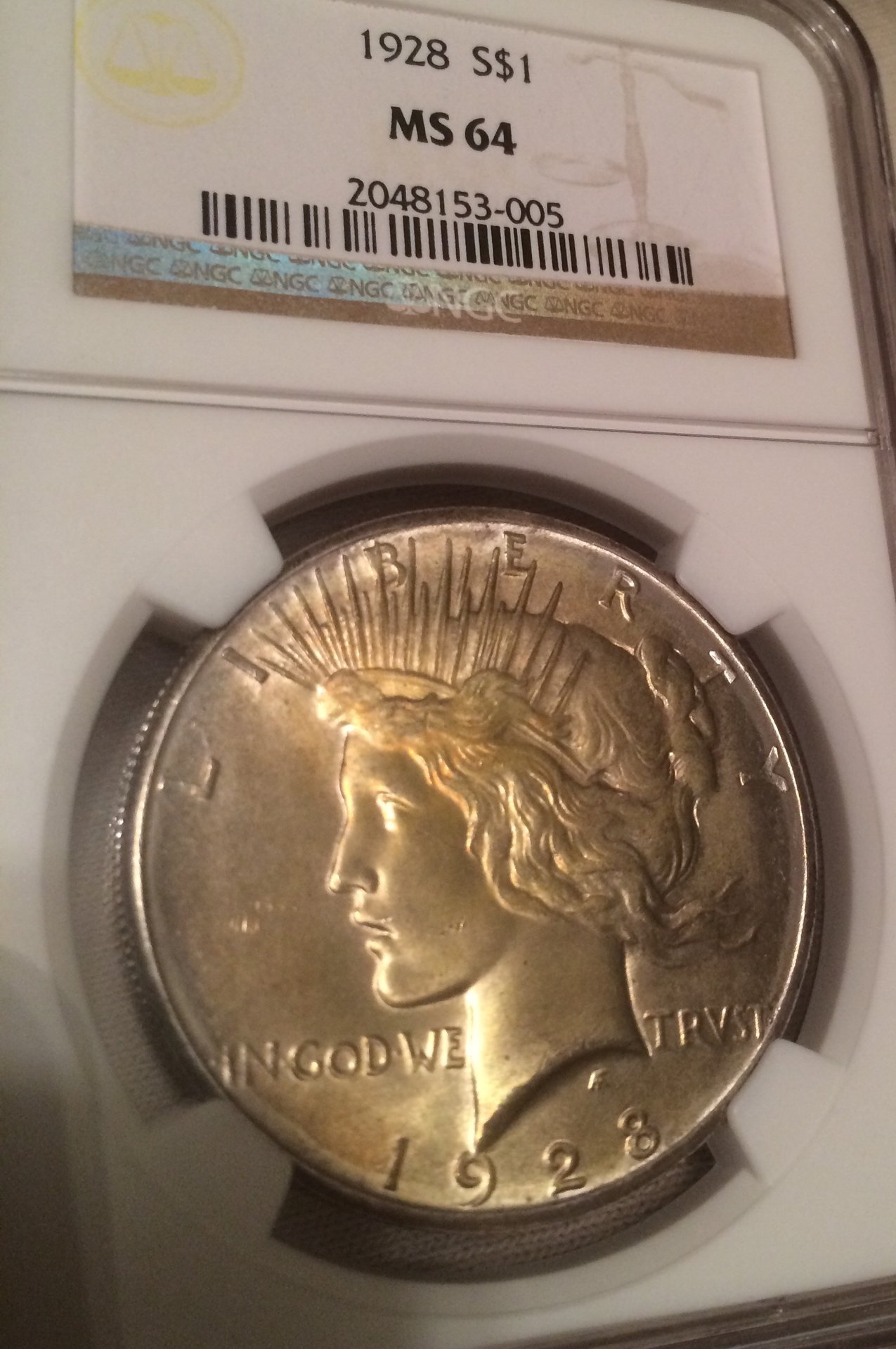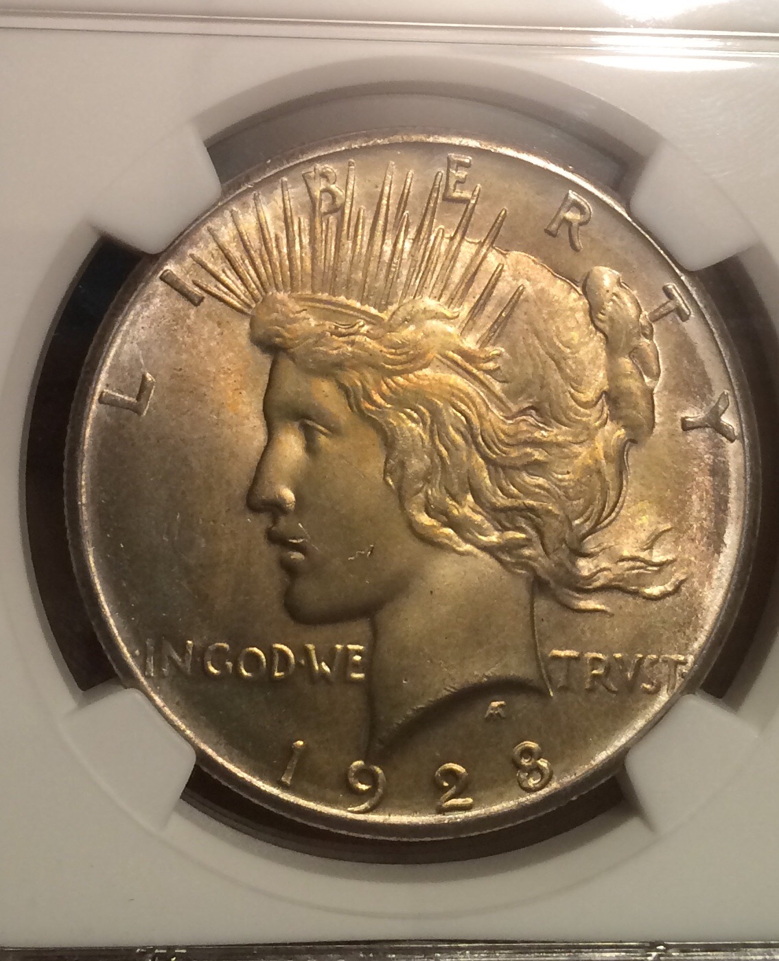 Stacks one bid over the reserve of $950. I wasn't at all looking for a 28 I just wanted a low relief peace with color for my type set but I figured a key date with color is a good investment pics are lousy. Has nice reddish Amber highlights in the hair and a good strike