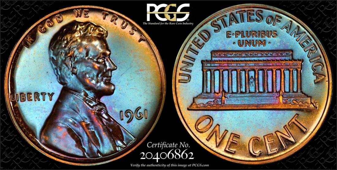 I recently bought this colorfully toned 1957 Proof Lincoln off ebay and finally have the coin in hand. Wow it's a looker! I got a great deal as it was only $12.61 plus $3 shipping. I will be sending this off to PCGS to see if it grades. These are the sellers photos ... And a few photos I snapped with my iphone through the PCGS submission clear cellophane envelopes (sorry about the glare) a few minutes ago. This coin has great color, tremendous mirrors, and no spots, which is pure heaven to a toned coin collector. If this grades PR66 or PR67 (which I think it may have a outside shot to do), I wonder if market value might be closer to $200 with the eye popping color it displays. If it comes back from PCGS in a Genuine, Quest. Color slab, boy what a tremendous job someone did on this one. Easily worth $12 just for the appearance.