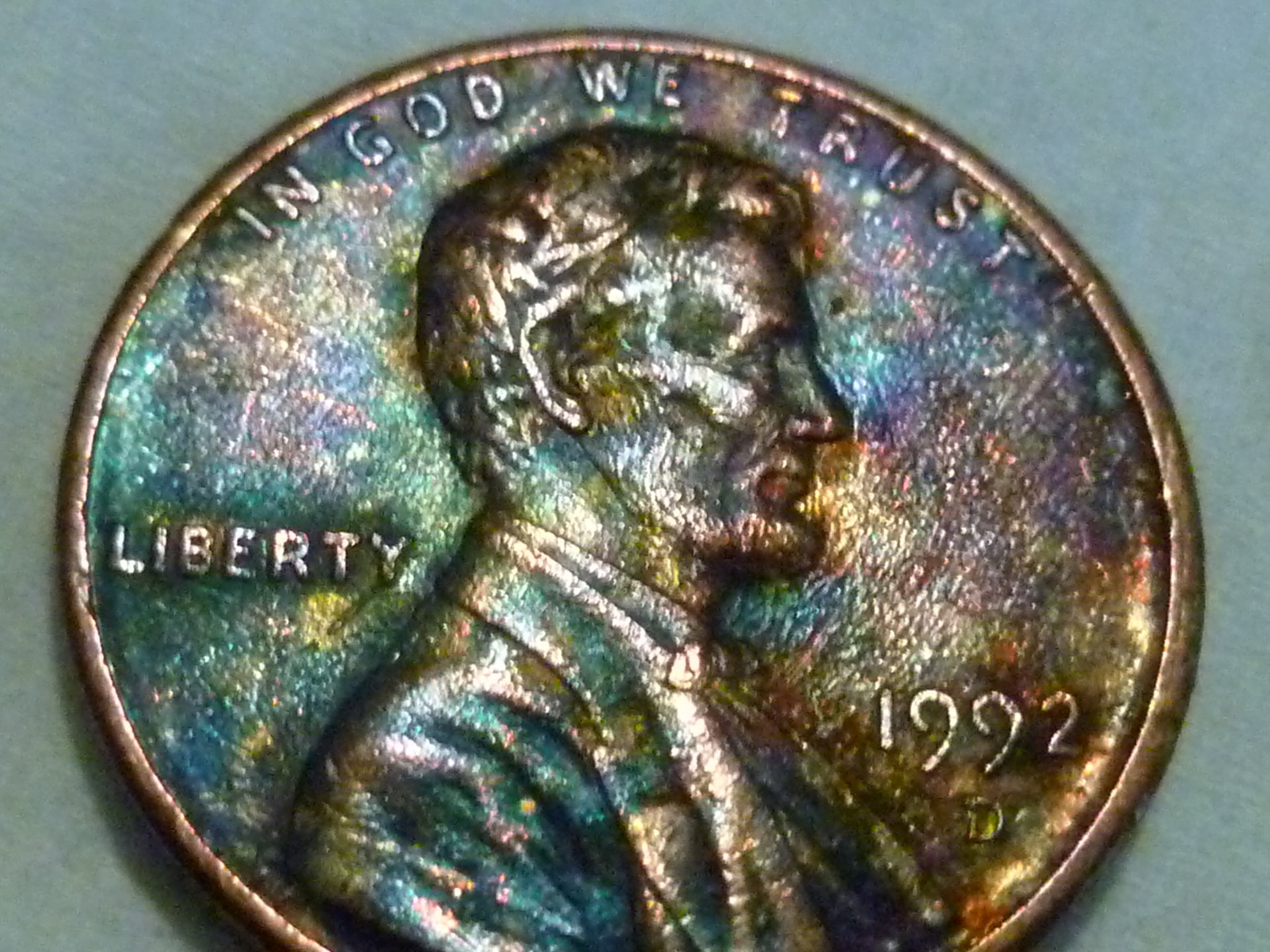 This one was difficult to get the way I wanted it. From most angles this proof is just a plain brown coin. I felt I should show that and the flashes of color at the same time.