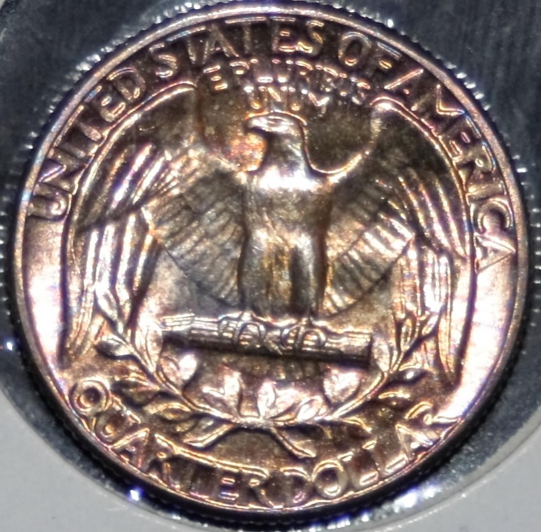 To answer the first part, not exactly. I didn't wash the coins after the acetone. The process was: acetone, blue stuff, acetone, water. I posted the coins here when it happened. On another note... why not take the quarter out of the cardboard flip to photograph? That will cut down on reflection imparted by the flip itself. As for the copper/silver toning, that doesn't make a lot of sense to me. Tarnish and patina have different names, because, for right or wrong, they are different metals being changed. A silver quarter shouldn't have the same colors as a copper penny, for the simple reason that they aren't the same material/surface. In order for that to happen, either the quarter or penny had a change in surface composition... or the 10% copper REALLY reacted and the 90% silver didn't.