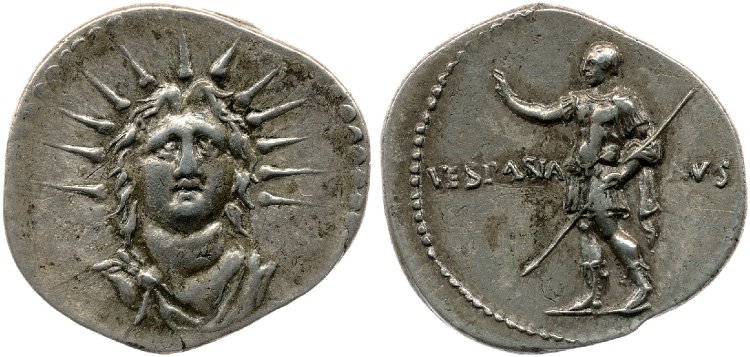 The Rome mint under Vespasian revived many reverse types from the past, including the above coin. The obverse copies a Republican denarius of L. Mussidius Longus, while the reverse echoes one struck by Augustus soon after Actium.