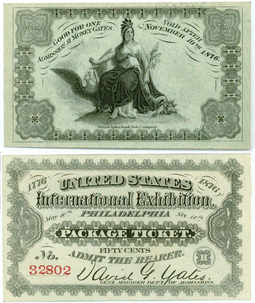Yesterday I picked up another couple nice pieces, including a check I'll post on a different thread and this ticket from the 1876 US International Exhibition in Philadelphia, engraved by the Philadelphia Bank Note Co. I've seen three different versions of this ticket. This one uses a security underprint on the reverse (with the vignette). There are also two types without the underprint, one with "Fifty Cents" overprinted in red across the face and one plain. Not sure which is scarcer type.
