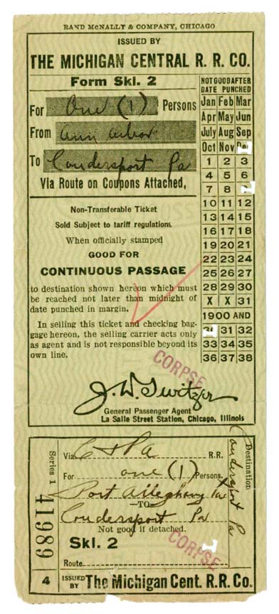 Okay, I've got a creepy one. I found this in a junk box somewhere for a couple bucks -- it was just too bizarre to pass up. It's a 1930 ticket for a ride on the Michigan Central RR from Ann Arbor, MI to Coudersport, PA. Not especially unusual...except that it was a ticket for a dead body. Apparently even corpses needed tickets. I'm guessing --hoping!--he rode in the cargo car. But maybe not. :eek: