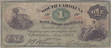 1873 fare ticket for the South Carolina Rail Road Co. "Good for the fare of one passenger twenty-five miles, Charleston, SC July 1st 1873"