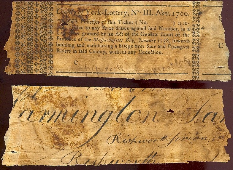 Whilst it would appear unduly economical to us in the 21st century, paper was quite dearly expensive during the 18th century - for that reason the lottery tickets were printed on the unprinted side of an older document, notice the signature of Rishworth Jordan on the reverse of the ticket. He was a prominent jurist from Winter Harbour in what is now Maine. During the American revolution he was appointed Chief Justice in the Massachusetts-Bay colony. He lived a very long life for the time, having been born in 1719, he would live until 1808.