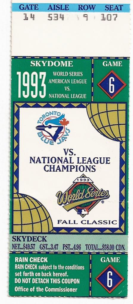 1993, Toronto Blue Jays win their second consecutive World Series Championship with a Joe Carter walk-off home run at home in Game 6. My favourite pro sports memory, and I remembered to keep the ticket!