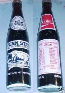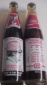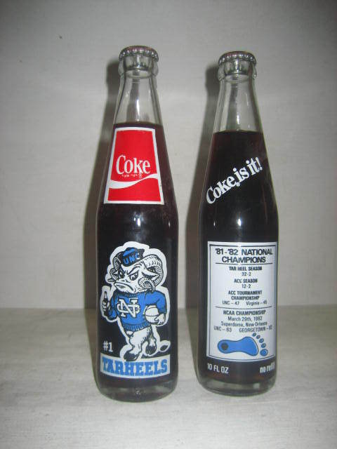 I can later once I get home but here's an idea from images I found online of a few I have (The Paul Bear Bryant one was my dad's favorite, had 3 of them. Not a championship but a milestone bottle for the coach): My favorite is my Tarheels 81-82 basketball championship bottle (Jordan was on team then): All of mine are still unopened. I wonder what the coke tastes like now?