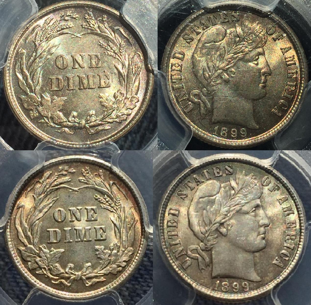 Gosh, that took me a minute to "get it." I must be getting old. It's nice to know that anybody reads and remembers. There's so much cool stuff in the BCCS journal but with only around 300 in the audience you never know if anybody even sees it. Being the "ugly" backwater of US collecting means there's still stuff to discover. Even an idiot like me can! I still can't believe no one noticed that the dime reverse changed in 1900 - I mean, come on! It was almost 120 years until I published about that in 2019. And our own @justafarmer recently discovered a new hub for the half dollar reverse in 1901. Anyway, to continue the theme, here's a crappy image of the 1892-1899 10c reverse versus an "early release" of the 1900 reverse. (The vein in the large lower left leaf is the obvious thing but there's more)