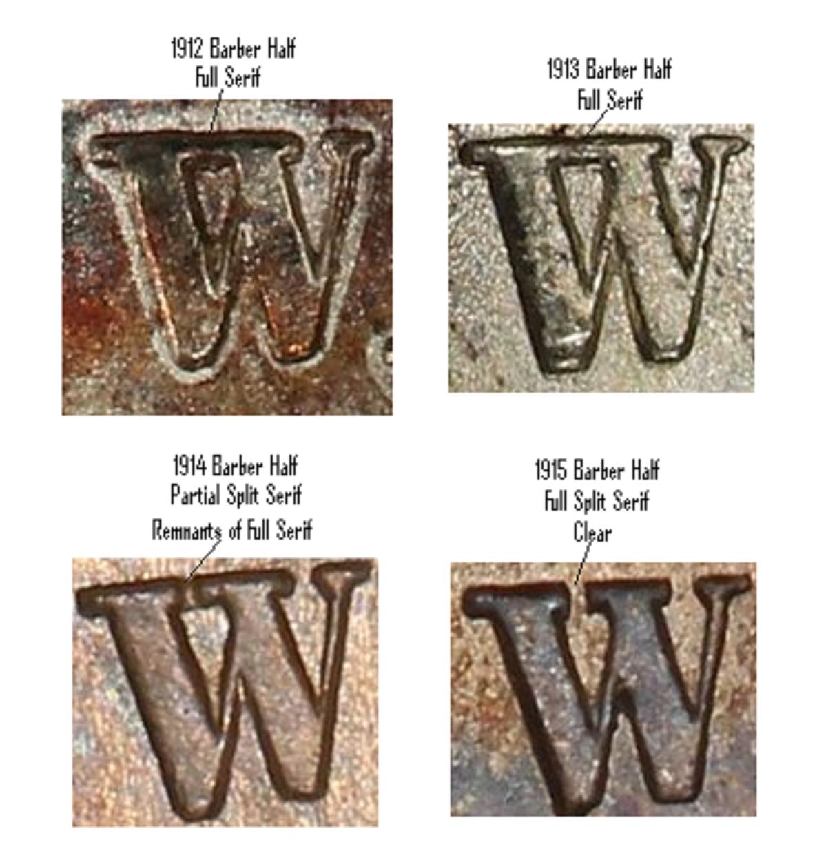 Time for another article! I haven't looked at enough coins to be definitive, but there appears to be a similar progression with the U, which through 1914 is a "full split serif", and then in 1915 becomes a "partial split serif", like the 1914 W. Perhaps we discussed this previously over email.