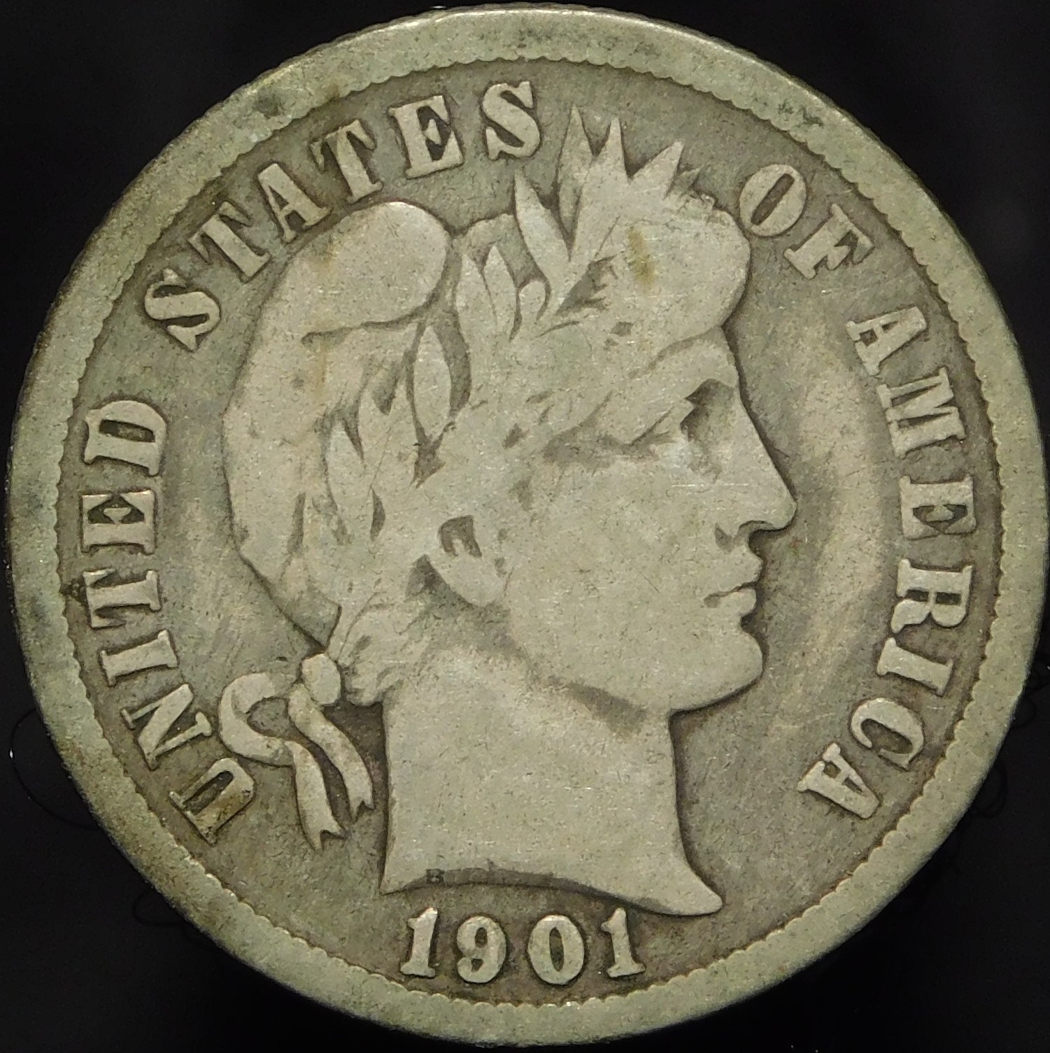 1901 is an interesting year for Barbers. Your 1901-O is Reverse 3, with the thick ribbon. All three mints produced both Rev2 and Rev3 (I think Rev3 was implemented around mid-May 1901). A census I did a couple years ago showed 1901-O was evenly split between Rev2/Rev3, 1901-P was 20% Rev2 and 80% Rev3, and 1901-S was 87% Rev2 and 13% Rev3. SF only made dimes in March and September, so only the small September mintage of 73,692 used Rev3. So a key date has a scarce variety! Here's my 1901-S Rev3.