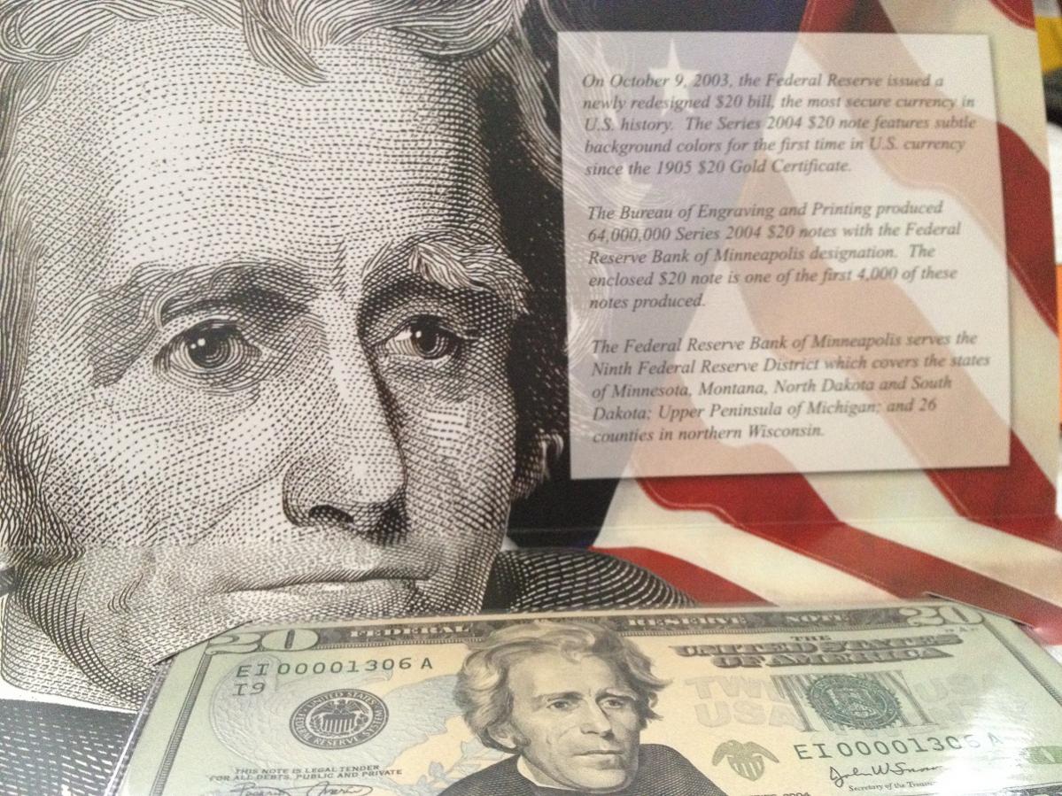 Series 2004 $20 FRN Lucky Money Note. Note: The bamboo and the Chinese characters on the front cover are a metallic gold.