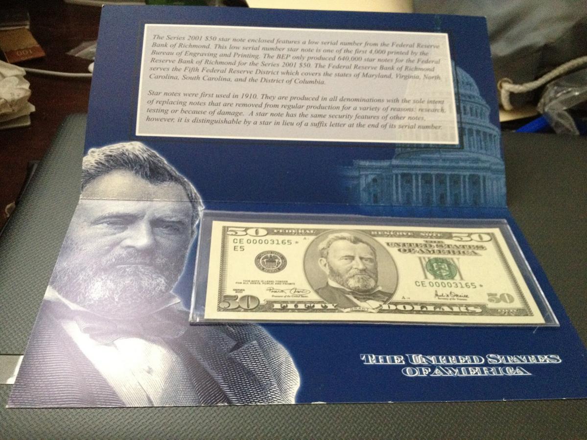 Series 2004 $50 FRN Lucky Money Note. Note: The Dragon Boat and the Chinese characters on the front cover are a metallic gold.