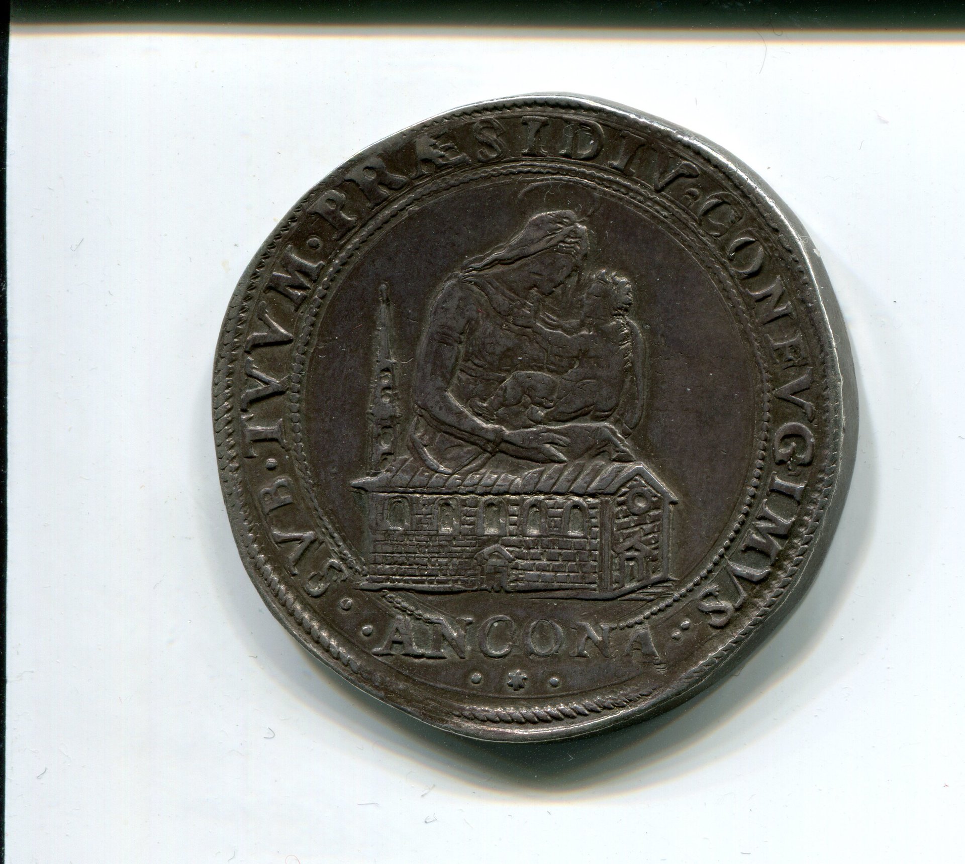 Italy PAPAL STATES - ANCONA Sixtus V Piastre 1588 with Virgin and child over Basilica della Santa Casa di Loreto on reverse. According to legend, Empress Helena on a pilgrimage in 336 had a basilica erected over Mary's house at Nazareth, converted into a church by the 12 Apostles. Threatened with destruction by Muslims, angels carried the house ( the Santa Casa) first to Rijeka (Croatia) in 1291, where an appearance of the Virgin and numerous miraculous cures attested its sanctity, then to Recanati in 1294 and finally to Loreto, near Ancona, in 1295. Sixtus V, who came from the Marches, built the facade of the basilica in which the Santa Casa lies today.