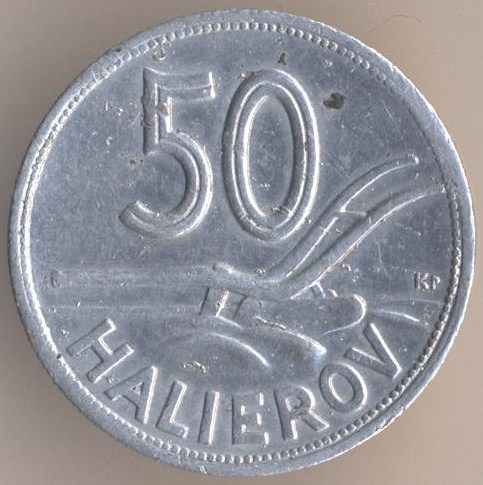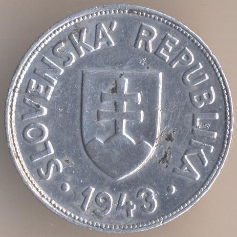 Slovakia as the Hitler's ally. 50 halierov 1943, aluminium, weight - 1 g., size - 20 mm, thickness - 1,5 mm, mintage - 4400000 pcs. A coins of this type were released at 1943 and 1944. Demonetized at February 29 1948.