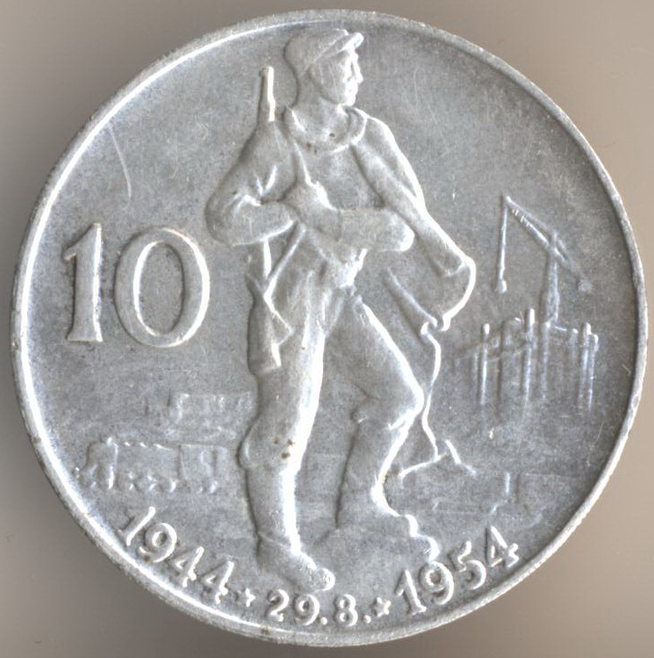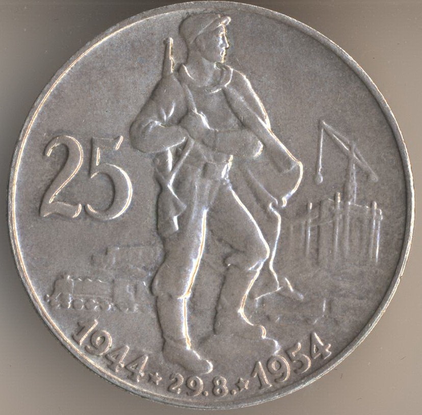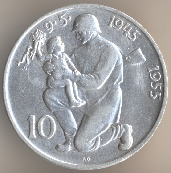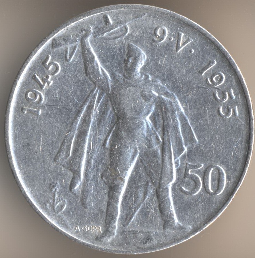 50 korun 1955. Soviet soldier - liberator of Prague. And this is the monument in Prague: Czech and Soviet soldier.