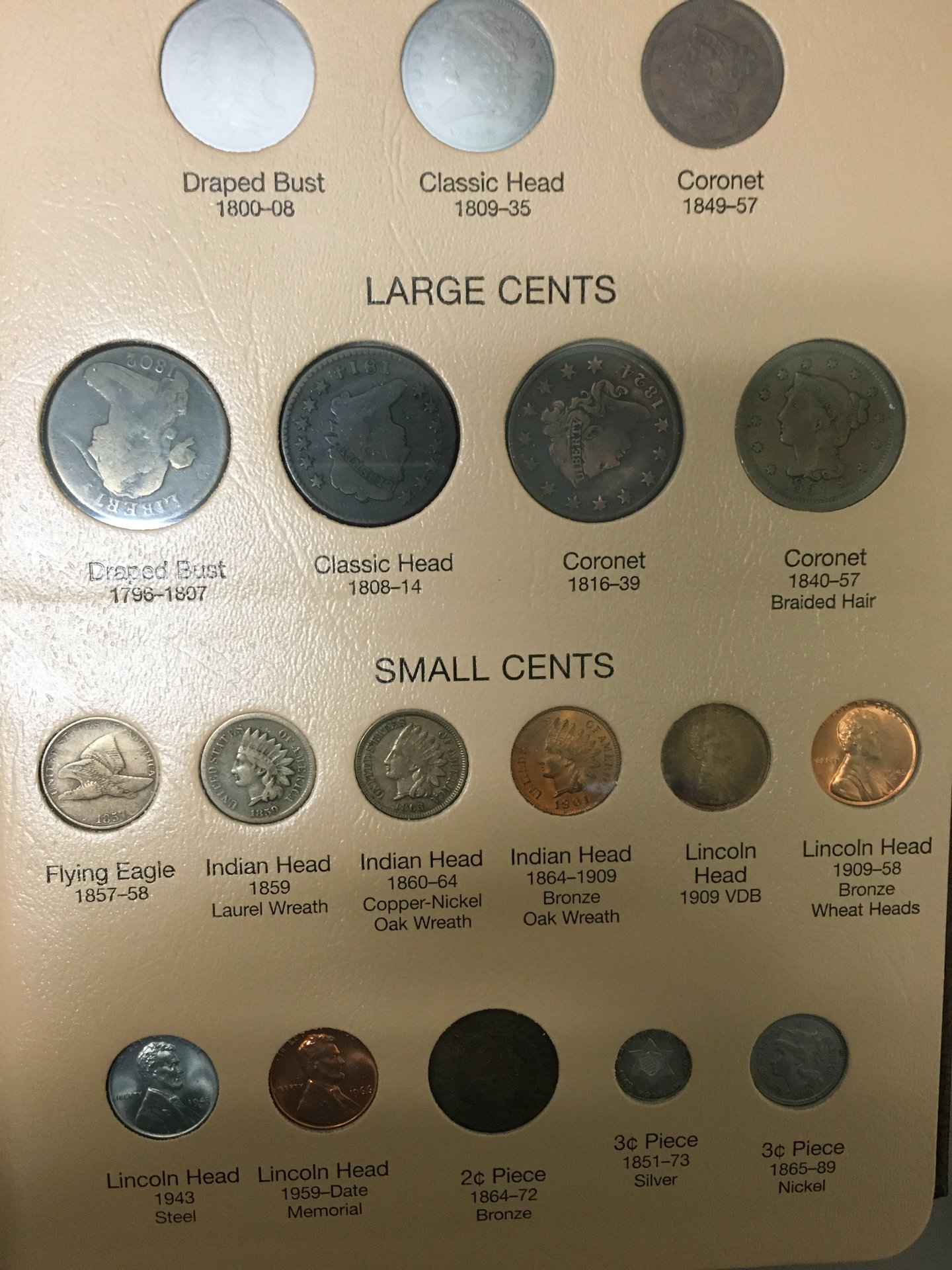 I got a decent photo of page #1 with all the copper coins. I was pleasantly surprised that you can see all the old copper in one photo. The 1859 Indian cent was removed & slabbed some years ago.