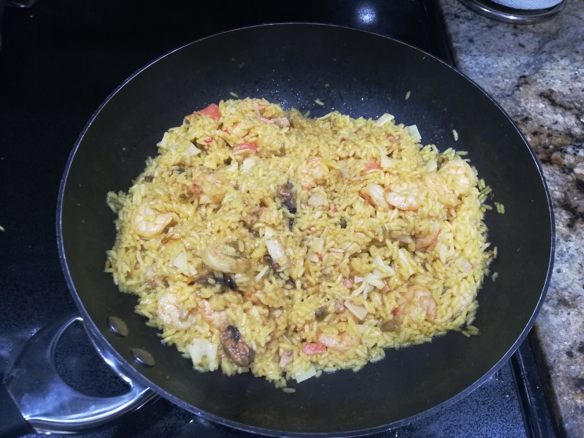 This is a meal and some tips, especially for the younger members here who are college bound. Today I cooked Sallent's World Famous Poor Man's Paella. This is a recipe I would whip out in college when I wanted to impress a girl, but was too short on cash to take her anywhere or to do anything elaborate. The ingredients are: 1. A pocket of yellow rice mix stired into 3 cups of boiling water in a large frying pan with a lid. 2. The cheapest frozen shrimps you can buy. 3. The cheapest imitation crab you can get. 4. The cheapest can of sea food shunks you can find (calamari, squid, or whatever). 5. Some "Complete seasoning", a dash of lime juice, and a dash of olive oil. 6. Cook for 20 minutes or so (until rice is soft but not too dry). Here is the finished product... I would have the table set nice, serve my date a glass of the cheapest Argentinian red wine I could find that was of drinkable quality (usually a $5 bottle). My date would see that I could cook, though I would hide some of the process from her. TIP: Don't let her see you using imitation crab, and play up the quality of the wine. Most people can't tell good wine from cheap but still drinkable wine anyways. I'm telling you, this and a movie date in the couch after the meal, got me a lot of compliments and kisses, etc., and all for about 25 to 30 minutes worth of effort, and a budget under $20. It shows you are house trained, thoughtful, and talented. Try it out on your college date once, thank me later. Man, it felt good to whip up an old favorite that I hadn't prepared in years You know what the sad part is, this recipe ends up tasting just as good as 95% of paellas I've eaten in restaurants out there. Anyway, here again is my latest Nero.