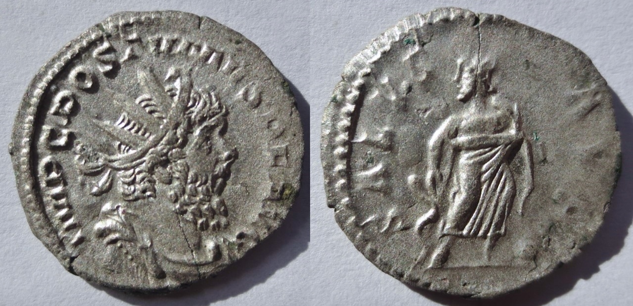 Here's mine, a fully-silvered Antoninianus. Milan, AD 268 2.84 g, 21.1 mm IMP C POSTVMVS PF AVG Radiate draped bust, r. SALVS AVG Aesculapius standing facing, head l., holding snake-entwined staff; globe at feet, r.; P in exergue.