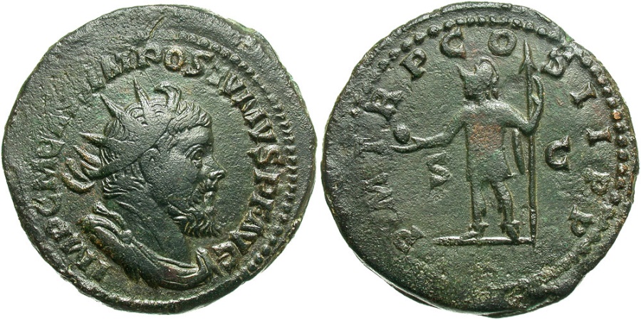 Postumus, 260 - 269 AD AE Double Sestertius, Cologne Mint, 35mm, 23.05 grams Obverse: IMP CM CAS LAT POSTVMVS PF AVG, Radiate, draped and cuirassed bust of Postumus right. Reverse: Postumus in military attire holding globe and spear. RIC106 // Sear11052