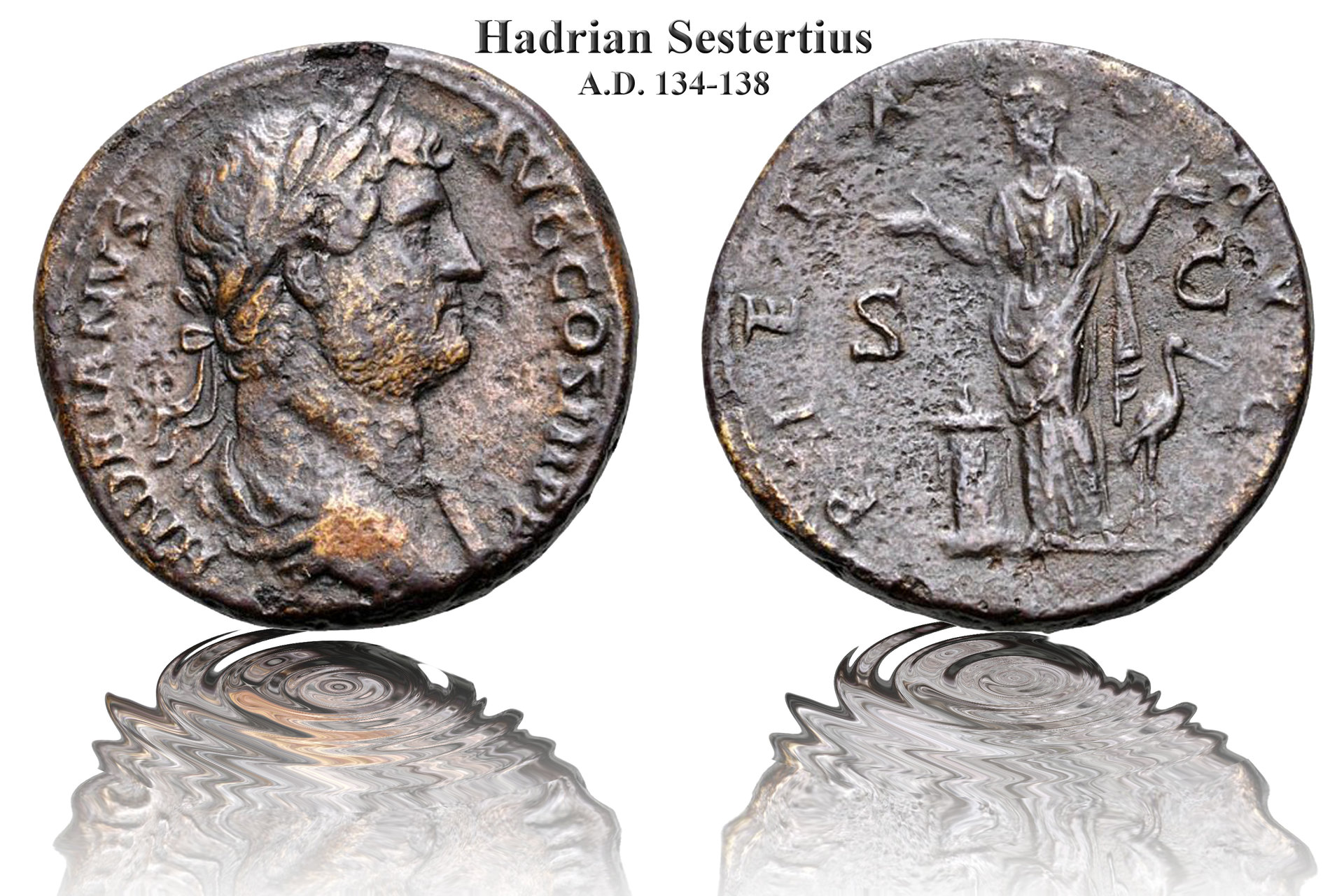 Sestertii of Hadrian, Antoninus Pius and Faustina. Hadrian (AD 117-138). Sestertius. Rome, AD 118. Hadrian seated left on raised platform with attendant distributing coins to a togate citizen climbing steps of platform; Liberalitas standing left behind attendant. Antoninus Pius augustus, 138 – 161. Sestertius. Rome. Pius seated on platform. Citizen r. mounting steps. Diva Faustina I Æ Sestertius. Rome, after AD 141. Ceres standing left holding two torches. Divus Antoninus Pius. Æ Sestertius. Struck under Marcus Aurelius in Rome, after AD 161. Funeral pyre of four tiers decorated with garlands. Quadriga. .