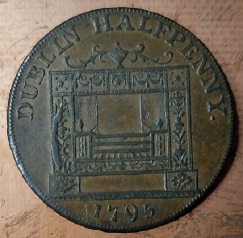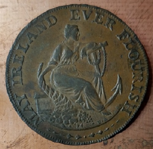 I have a half penny too but it has a crown counterstamped across the portrait. An interesting addition for me as I'm a collector of these old...and new... counterstamped Irish coins. This one was dug in Northern England some time ago so is a little rough but the detail is still decent. This is the seller's picture but I plan on getting better images when I have a chance. I also have two 1690 Corke siege pieces overstruck on William Ballard tokens. Bruce