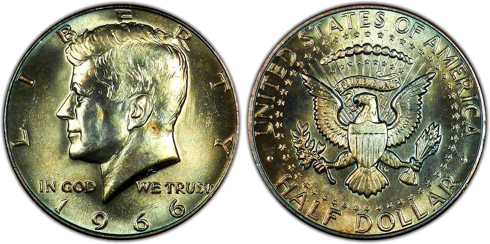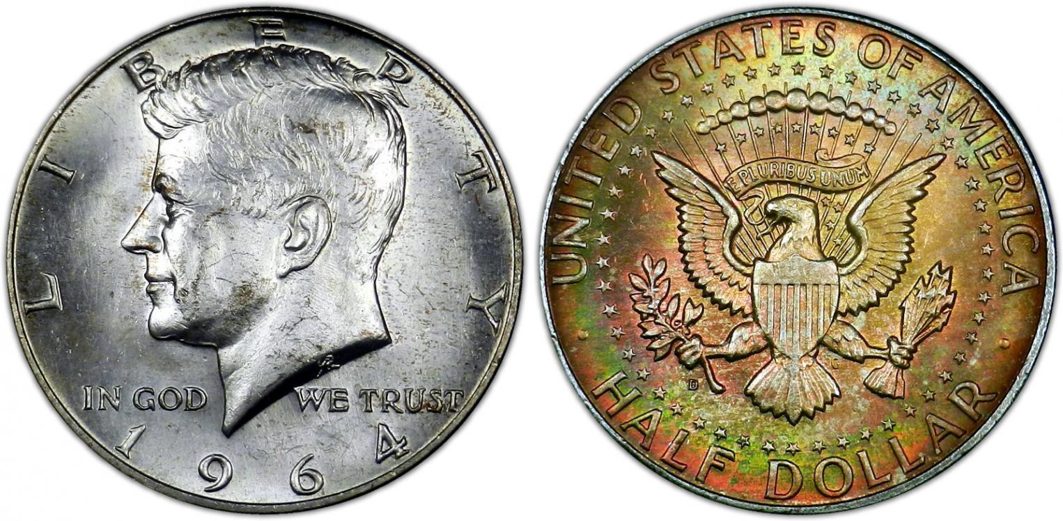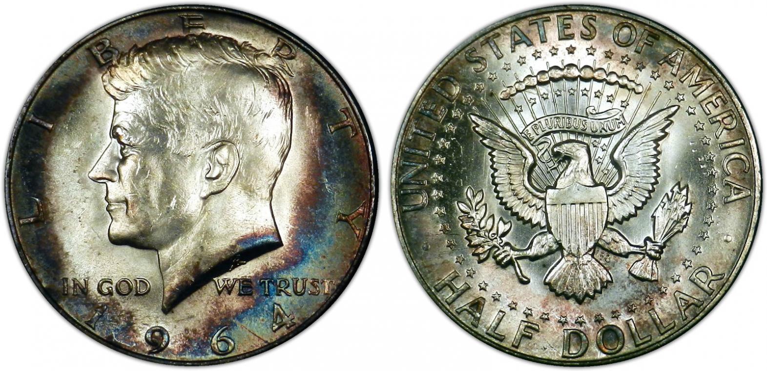 The ironic thing is that when the first Kennedy Half Dollars were minted in 1964, Jackie Kennedy objected to the hair detail on the proof issues, so the engravers smoothed out his coiffure somewhat. Nevertheless, a small percentage of 64 proofs with the "accented hair" device were issued, and they're now much sought after by collectors. This is what the variety looks like.