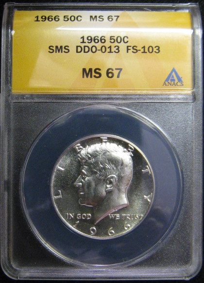 Here are 4 of the 8 that I found of the 1966SMS DDO variety. The other 4 are duplicates of these. Pop 8/2 graded higher No Pop reported. Don't know why? Top POP! Top POP! When I found these, I sent them off to CONECA for attribution. The FS-103 was a dead ringer and easy to identify, but the others not so. The FS-103 is typically considered the coin of choice for this variety as it has some of the strongest doubling. After they were attributed, it was suggested that I send them off to ANACS because PCGS and NGC only attribute the top 5 that are found in Cherrypickers while ANACS attributes all the known DDO varieties....and there are at least 23 known varieties.