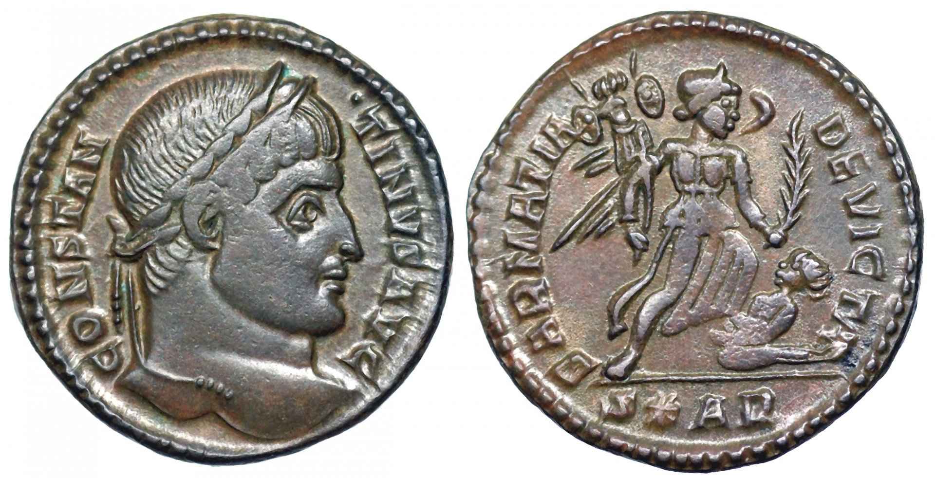just cleaned up Constantine I A.D. 322-323 19mm 3.0g CONSTAN-•TINVS AVG; laureate head right. SARMATIA DEVICTA; Victory advancing r., holding trophy, palm branch, spurning captive std. on ground to right. In ex. S✶AR RIC VII Arles 257 There is a dot in the obverse legend--•TINVS AVG The Sarmatia coins were issued from London, Lyon, Arles, Trier and Sirmium. “When Constantine learned that the Sarmatians, who live near Lake Maeotis, had sailed across the Danube and were pillaging his territory, he led his army against them…he killed many, took more prisoners and put the rest to flight.” Zosimus 2:21 "Licinius did not accept the gold coinage on which Constantine emblazoned his victory against the Sarmatians, but melted it down and converted it to other uses, giving no answer to those who faulted him with regard to this than that he did not wish foreign affairs to have a place in domestic business." Petrus Patricius (circa A.D. 500- 565) The Lost History of Peter the Patrician F 208