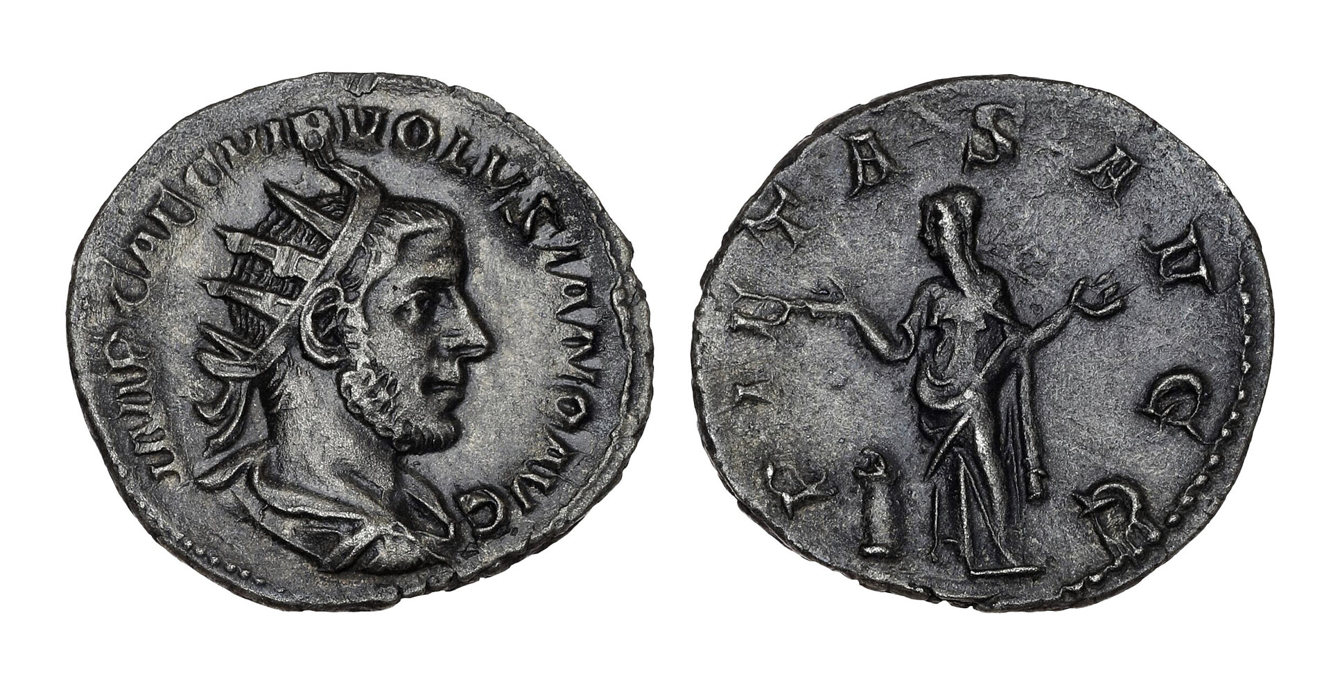 https://www.biddr.com/auctions/astarte/browse?a=5636&l=6918188 Obverse: IMP C C VIB VOLVSIANVS AVG Reverse: MARTEM PROPVGNATOREM That is what it says according to the auction house.