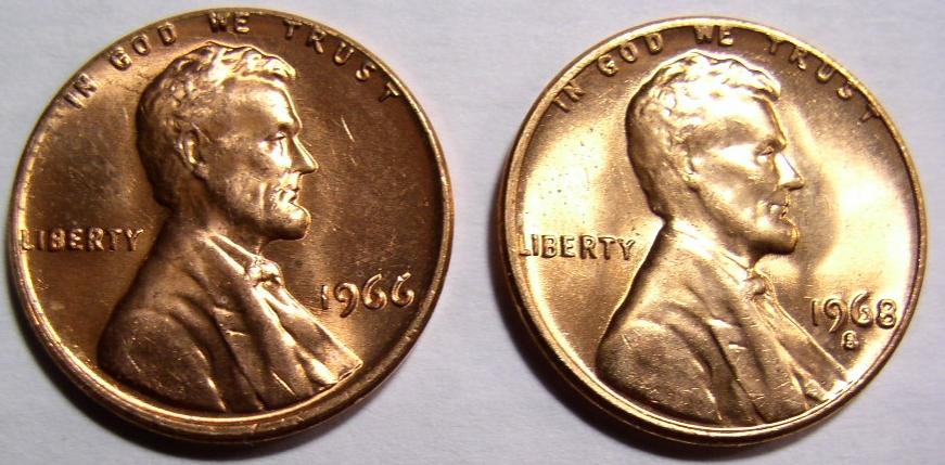 Results from PCGS (Pocket Change Goodie Searching) - found these recently. Not rare, not key, but hey, 95% copper, and only 1c each! I run across AU red 1968-s cents in change fairly often, for some reason .