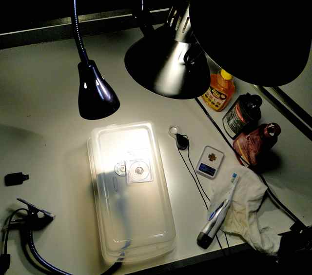 This 1916 S is a NEWP for me and I just couldn't wait to get it pictured here. This date in MS65 has eluded me for quite sometime and when this one was offered for sale, I pursued it with little hesitation. I find the die erosion around the throat pretty cool and it makes for strong mint luster overall. The reverse obviously shows a little more red mixing with brown which I think makes for an interesting effect. JMO This is a quick shot of my makeshift photo booth. I use two simple desk lamps in a darkened room, one with a 75w Spot flood lamp for focused incandescent light and the other one with a regular 100w incandescent bulb. The other two smaller lamps are for lighting up the inner recesses on older NGC slabs or other dark areas as needed. The plastic container was a quick way to bottom light my slabs so I can eliminate the dark shadows on PCGS and prong NGC slabs. I always have GOO GONE around to wipe off pesky sticker residue. The clear coat finisher polishing compound is always close and with a soft cloth wrapped around the electric toothbrush head, makes for pretty quick scratch remover. My camera likes to focus on either the coin or the scratches, so removing most of them first makes for crisper photos. Pretty low tech, but effective I think. Thanks, Matt