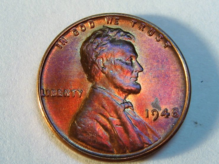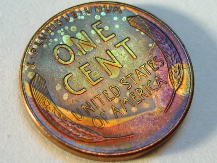Here is a pic of the 81s, reverse. Zoom in for unc evidence. There are three cleaned, and an 80 shown, same casual storage, for comparison. The only blemishes are what ever occured as they sat. Way too vivid as a wrapper reaction. Webbed and splotched due to dissimilar metal reaction? Incomplete mixing leaves one with what you started with, two different metals. Some is alloyed, to an extent, hence, a lesser corrosive reaction. The splotching is inconsistant, because the planchet has unknown ratios of zinc/copper throughout. A simple way to imagine what happened, is mixing chocolate syrup with milk, but not stirring very well. Badly mixed marble cake, another, just sayin... Those colors, as well as my avitar, are not stains! It is the color of the planchet itself, in each particular "spot", blue, red/blue. Some edges, most, are not soft edged as one would expect with "staining". If the planchet were absorbant, the spots would be puffy edged. Also, since when does brass alloy pennies "stain", permanently, saturated and unremovable? From a kid on, myself and millions of others, using only saliva, rubbing, erasers, you name it, had made zillions of them look like "new" again. Tar was tough, mind you, but I've never shined one up that resulted in a look like these 81s, not even close..There is an error site that addresses bad alloy mix, from no mixing at all to almost mixed, just saying. It's gonna take some time, skeptics abound, inferences too, unstandably. Anyway, again, OMR, amateur storage, unc, untainted, honest discovery. It remains something to look closer at. Marbled in folks, that's what Im seeing. Again, Wilmington De area, open for inspection..Meantime, scope and look, a mirad of hues, zinc blue, copper red, radical blending, blue and red make purple, etc., etc....