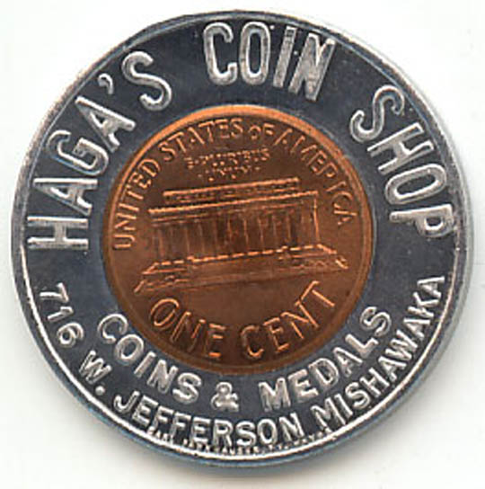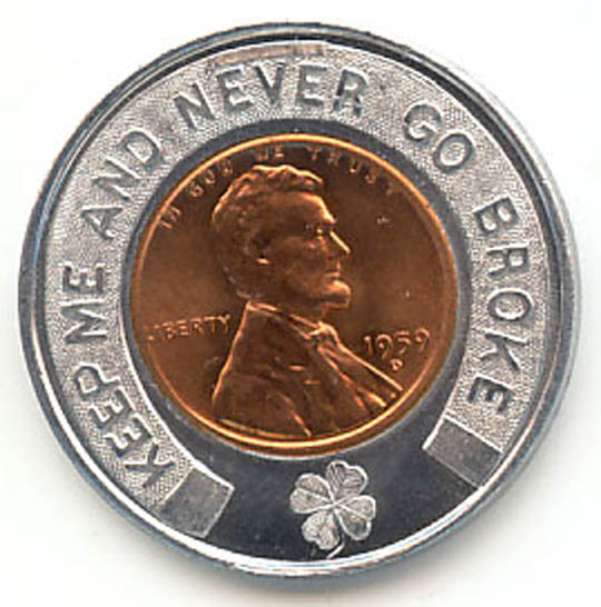 No one has "encased cents"? I discovered them last summer, in a numismatic fair in Italy. I approached a dealer who had ten coins made from 1 cent Lincoln, bordered by an aluminum ring, with various inscriptions. Intrigued, I bought one, the one in picture, with the 1959 penny, chosen because the insignia of a coin shop, and when I got home I looked for some information. I discovered a world that did not exist before for me, the world of encased coins :yes: Encased coins are tokens that have at their center a coin, usually of small value, 1 penny or more, while the outer ring, generally aluminum, shows on one side advertising of the most varied commercial activities. In mine, 'Haga's Coin Shop - Coins & medals', Mishawaka, Indiana. They are also known as 'lucky pennies', because many of them bear symbols and phrases of good luck. In mine, a four leaf clover, and the words KEEP ME AND NEVER GO BROKE. Their purpose was strictly promotional, dealers gave them to their customers, over time they became wanted collectibles. Although they continue to produce today, even as a souvenir, the use of encased coins as an advertising medium disappeared almost entirely in the '60s, when dealers began to find cheaper to promote their activities through other objects, such as pens. To me, it did'nt bring much luck, because after it, is no longer able to buy more. I met again that dealer in another fair, but he had sold them all Do you have some of these? petronius