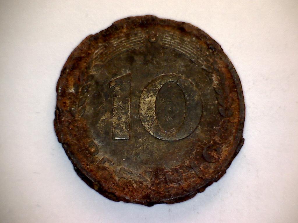The first coin might be a Kreuzer with unidentifiable date, the second coin is 10 Pfennig from 1959 with a mineralized reverse.