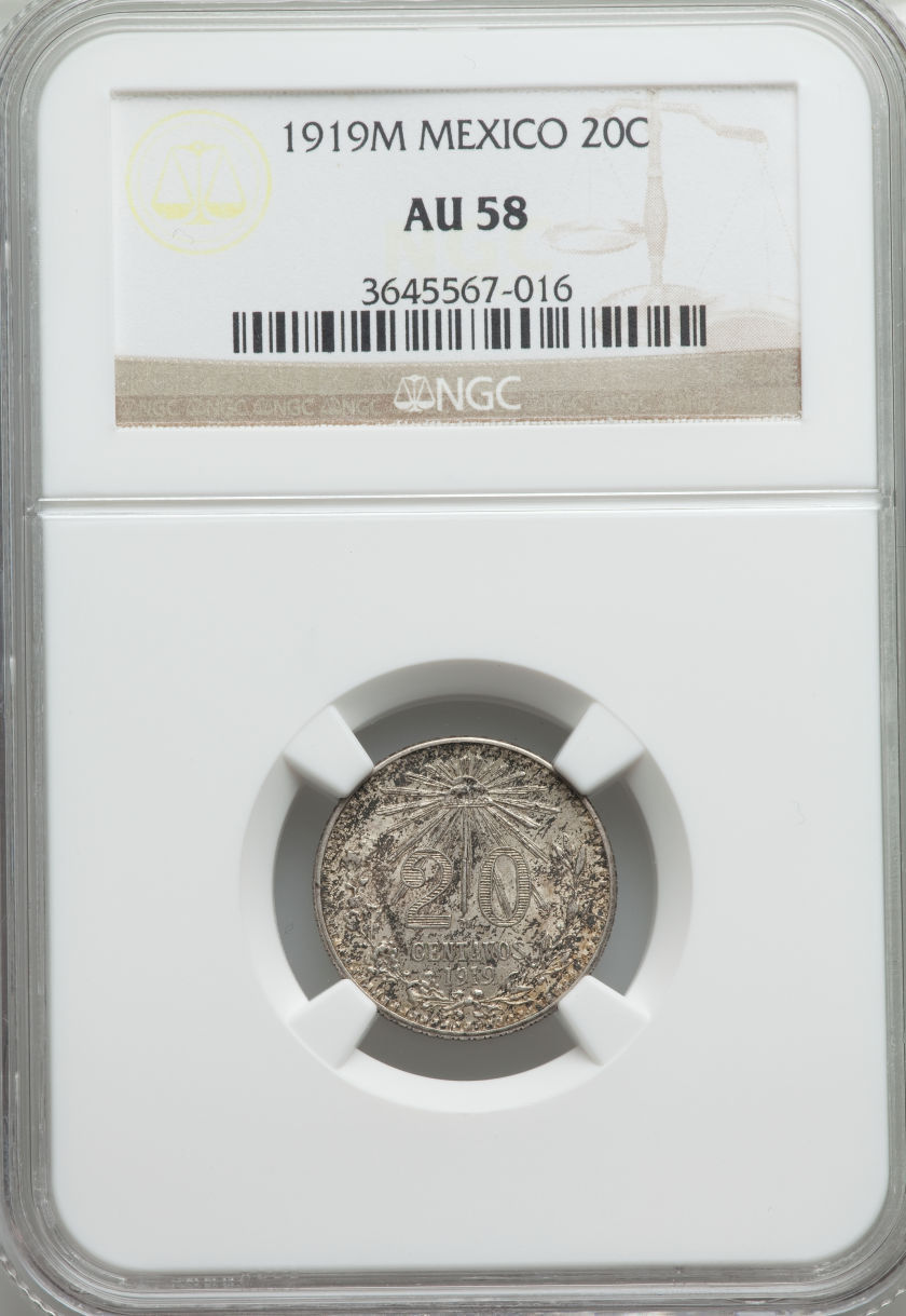 I will start us off with a 1919 M 20 Centavos Mexican coin slabbed by NGC in AU58 this is a bit rarer date and was a great pick up for the price it was at