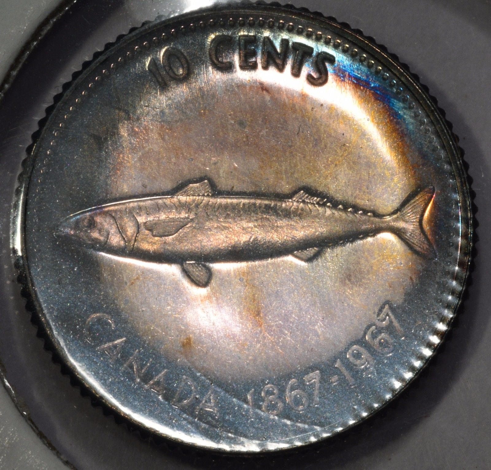 1956 PCGS PL65 toned Canada 10 cents. gorgeous toning. sellers pics...